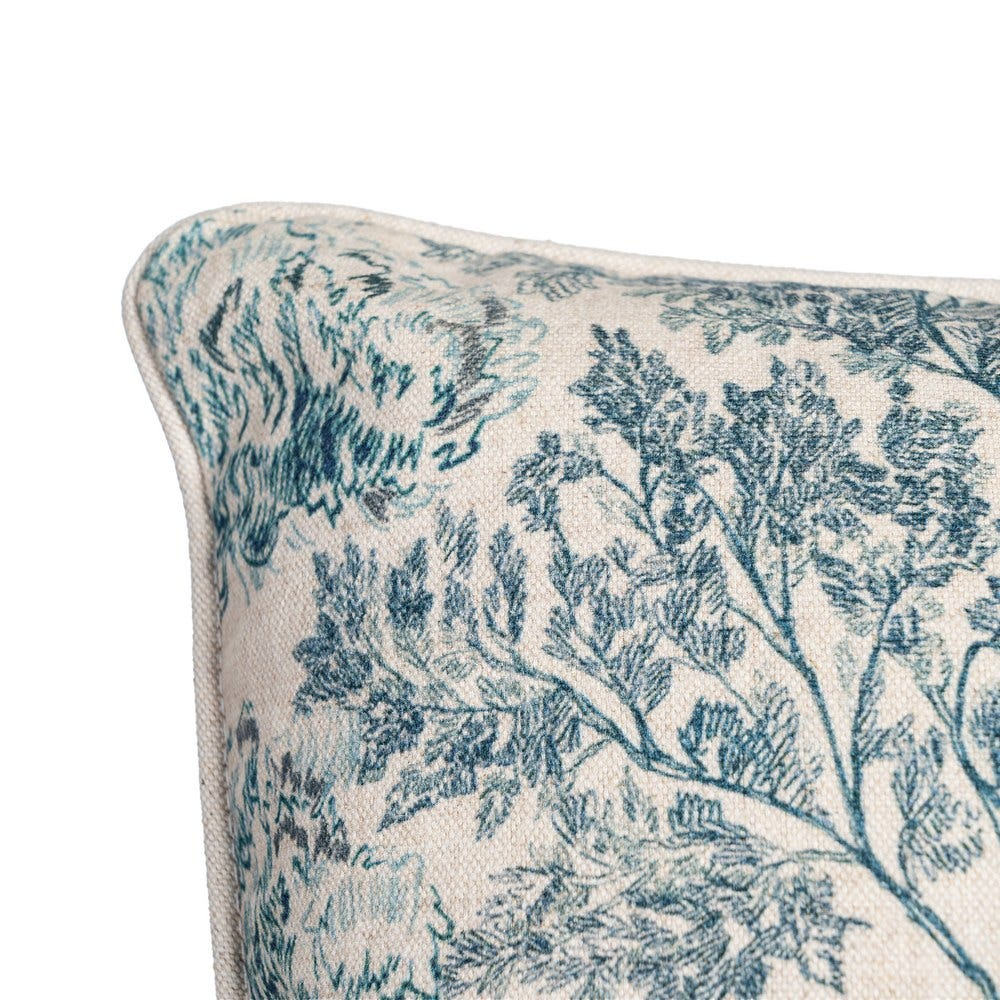 Suprafața pernelor este decorată cu un model vegetal amplu ce îmbină siluete de arbori și flori stilizate, dispuse pe un fundal crem deschis. Nuanțele de verde și albastru conturează detaliile grafice și oferă un contrast delicat, păstrând un aspect luminos și natural.