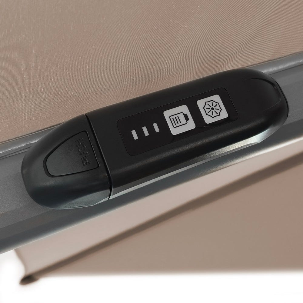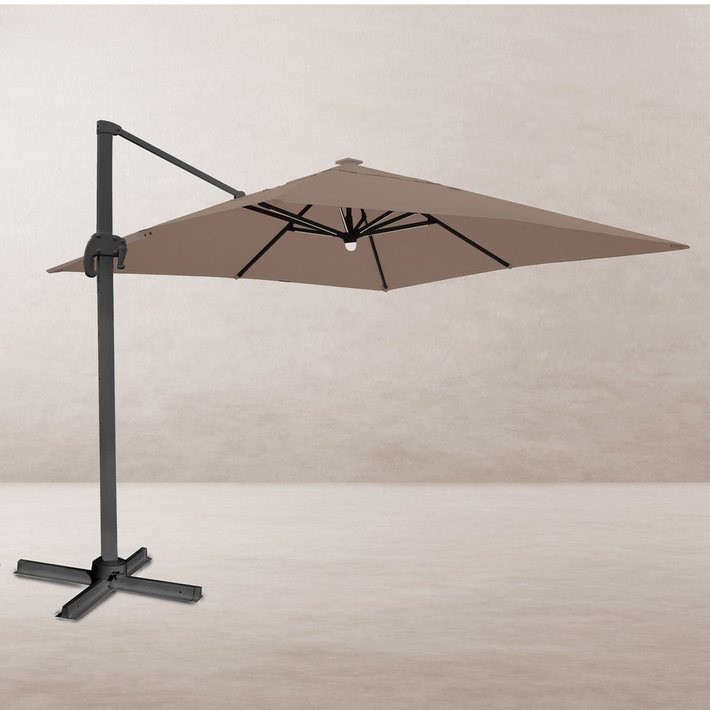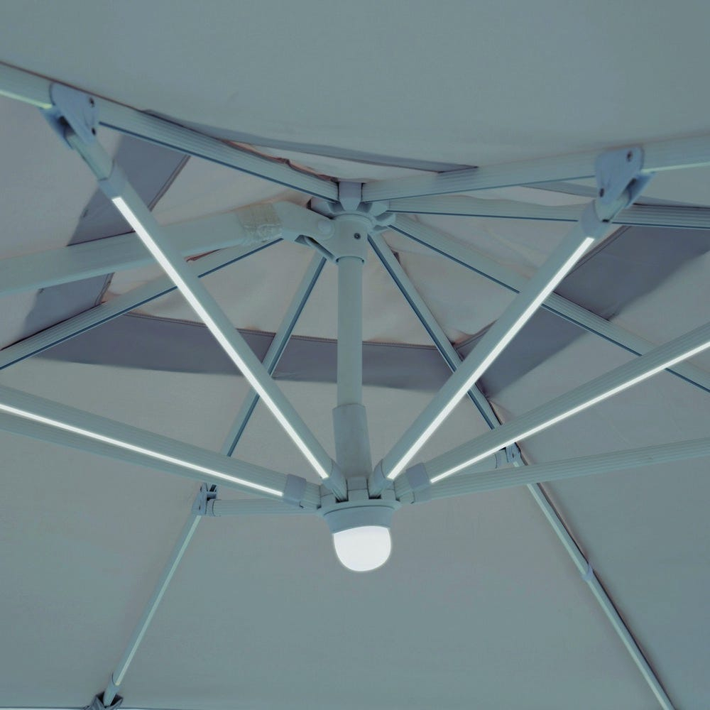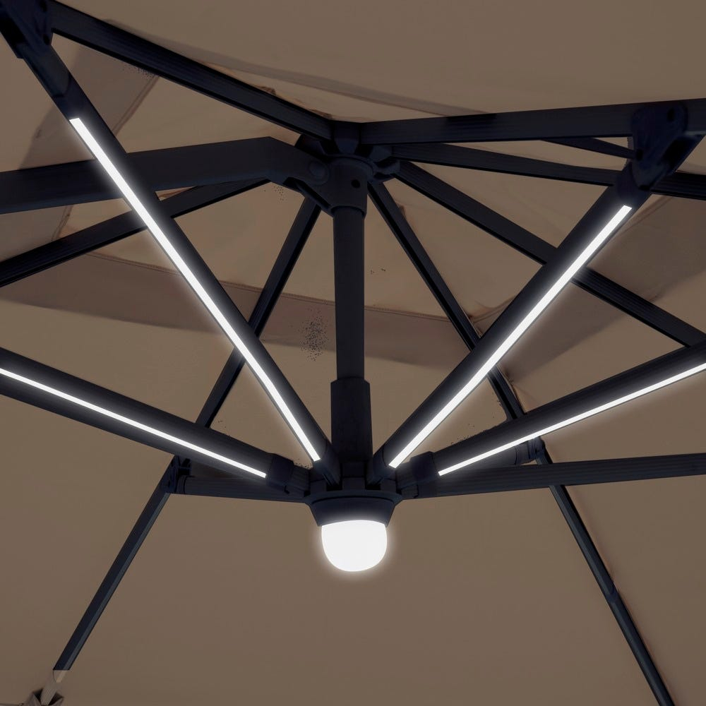 Umbrela Eccentric LED este o piesă statement pentru grădini, terase și zone de lounge premium. Dotată cu un mecanism rotativ complet (360°) și un sistem de înălțare ergonomic, această umbrelă nu doar protejează, ci creează ambianță – chiar și după lăsarea serii, datorită celor 54 LED-uri alimentate cu energie solară.