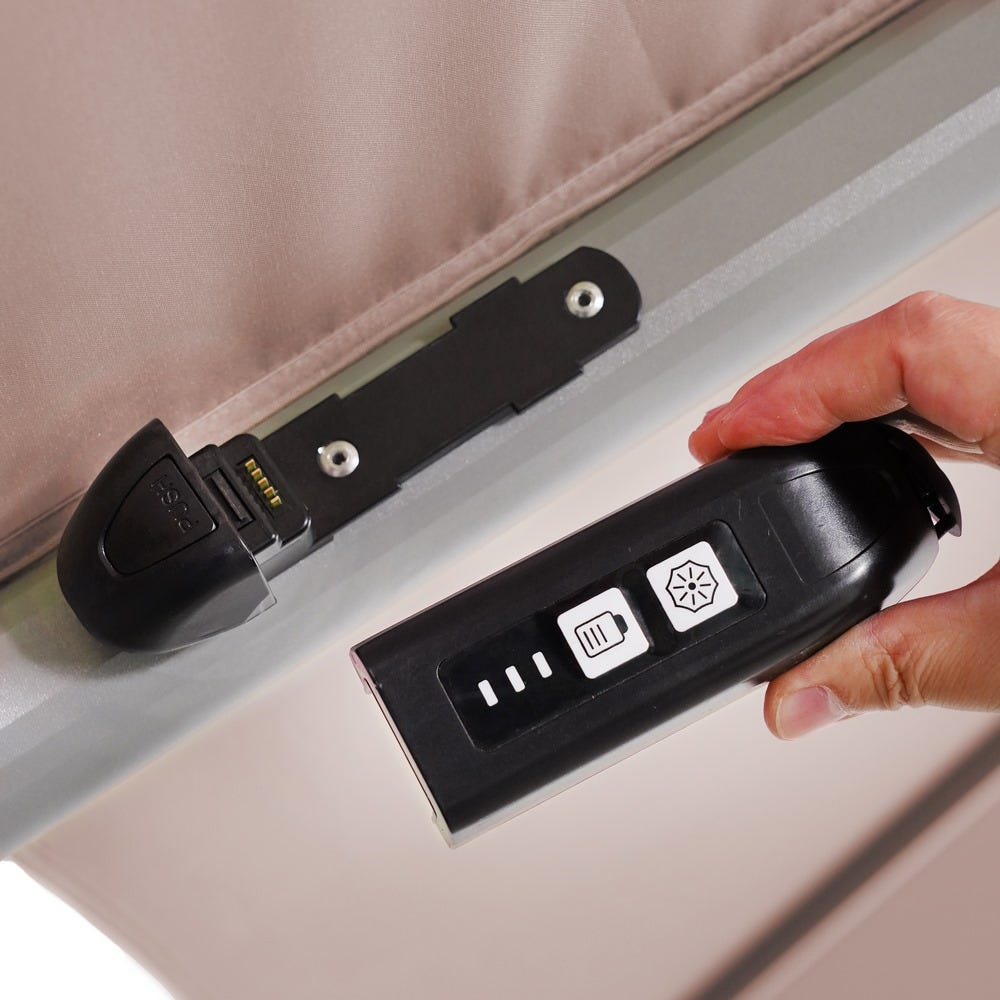 Textilul gros din poliester impregnat este rezistent la ploaie și soare, iar sistemul de ventilație integrat previne acumularea aerului cald. Este o soluție inteligentă pentru confortul exterior, în care tehnologia se îmbină perfect cu funcționalitatea și designul elegant.