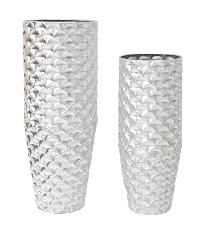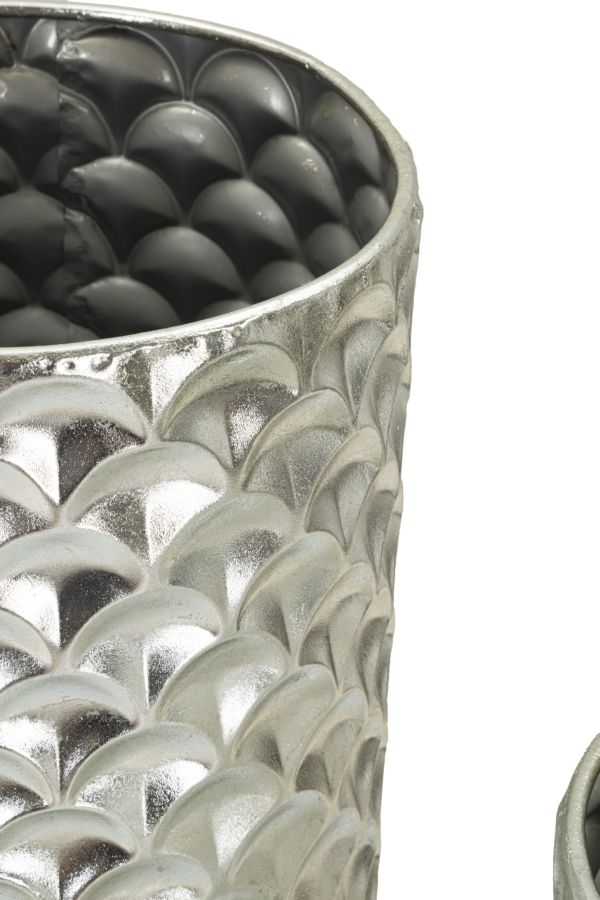 Suporturi înalte de flori din metal argintiu, cu model în relief, perfecte pentru crearea unui punct focal în încăpere. Ideale pentru spații ample, adaugă o notă de lux și sofisticare interiorului.