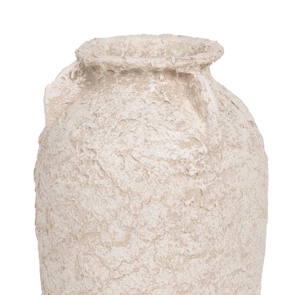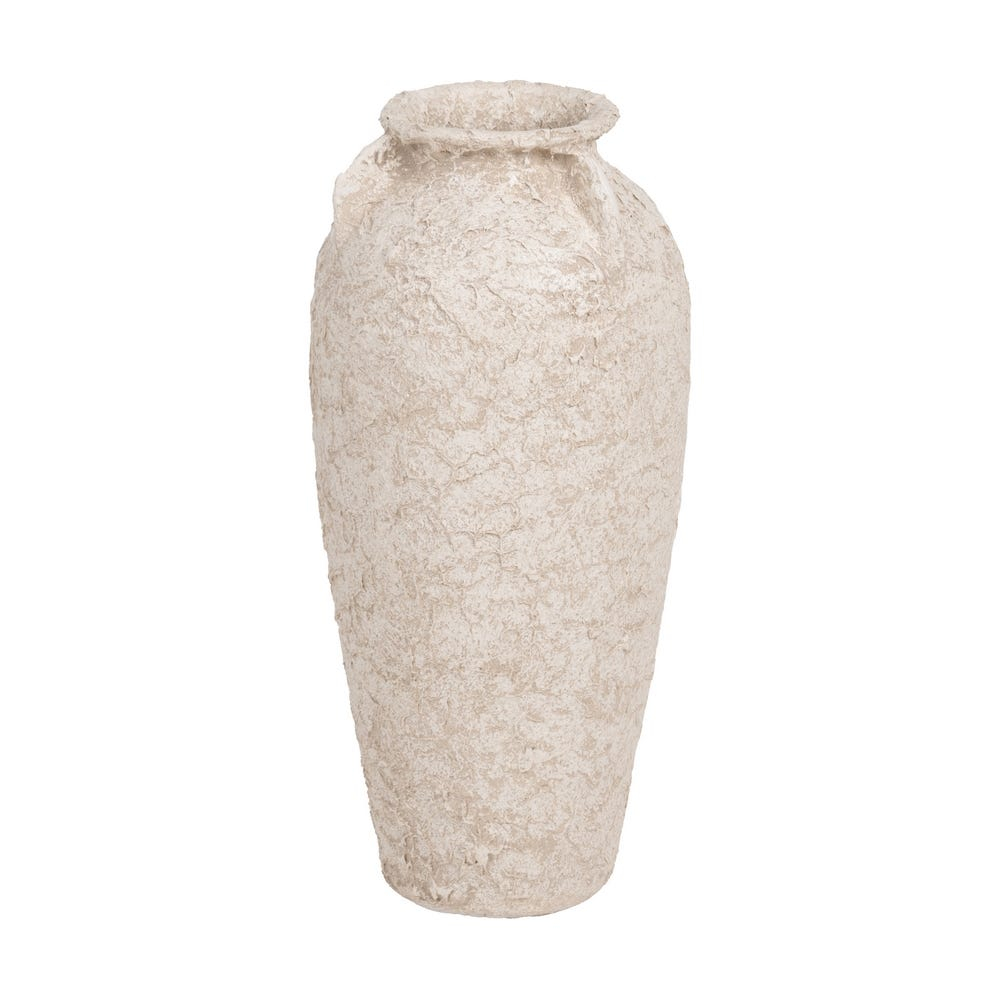Suprafața este texturată și ușor neregulată, ceea ce oferă vazei un aspect autentic și plin de caracter. Nuanța de alb este versatilă și pune în valoare forma înaltă, contribuind la un decor calm și echilibrat.