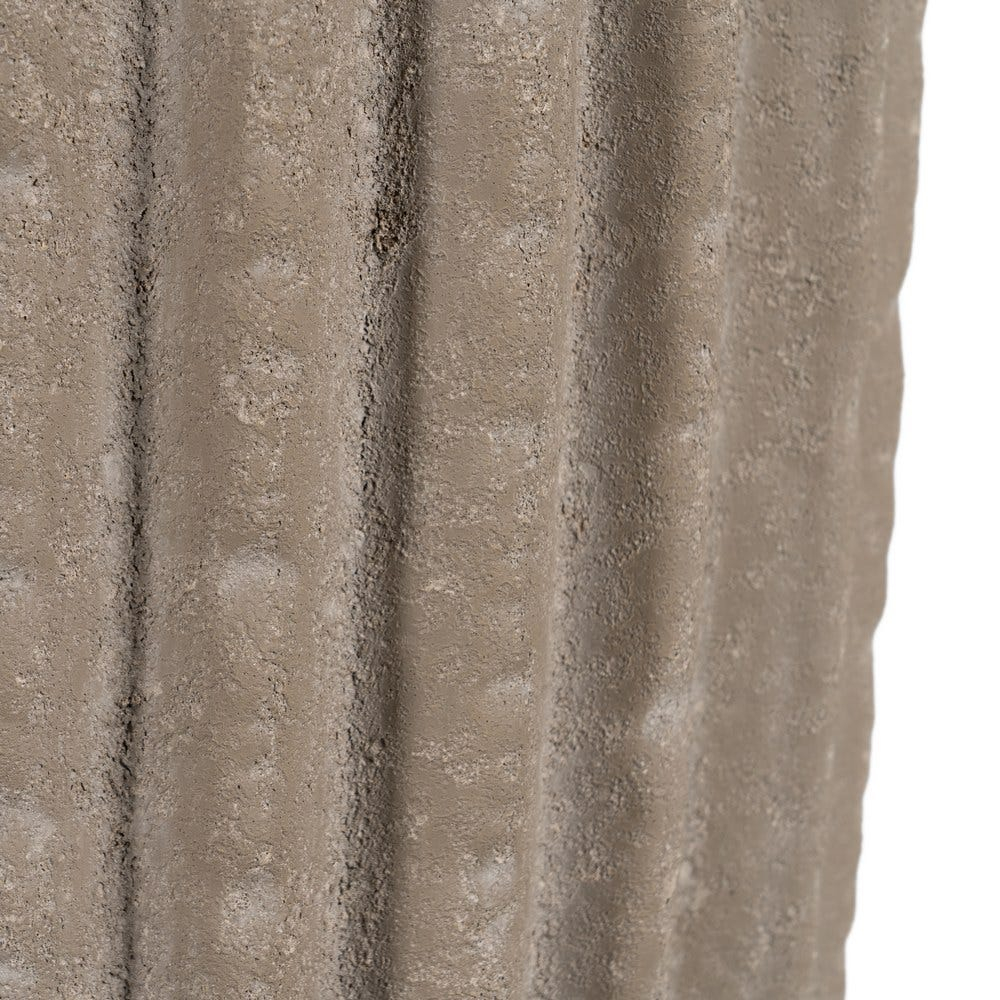 Suprafața este decorată cu linii verticale reliefate, care oferă textură și accentuează forma înaltă a vazei. Finisajul cu aspect de piatră adaugă profunzime și un aer natural, potrivit pentru spații în care se caută simplitate și echilibru.