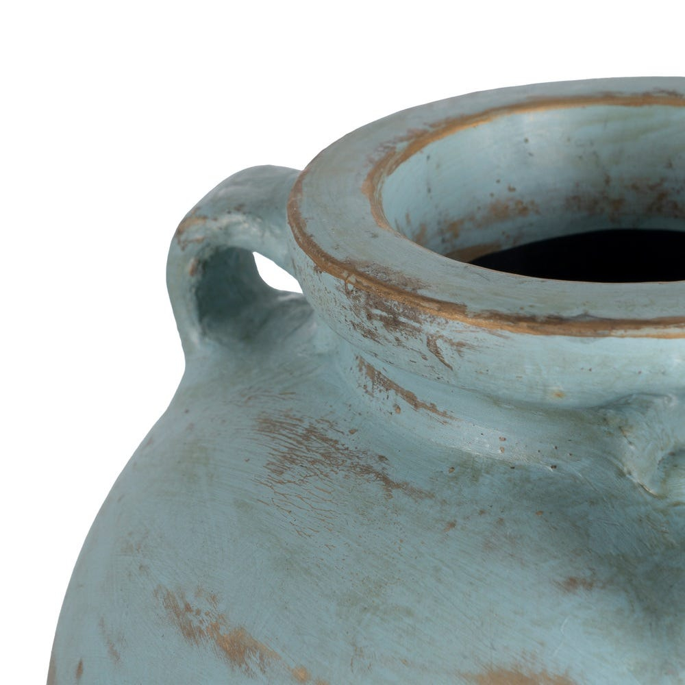 Această vază decorativă înaltă din teracotă turcoaz aduce un plus de culoare și autenticitate în orice spațiu și se integrează ușor în amenajări relaxate și luminoase. Forma sa alungită este completată de două toarte laterale, care oferă un detaliu decorativ subtil și un aspect echilibrat.