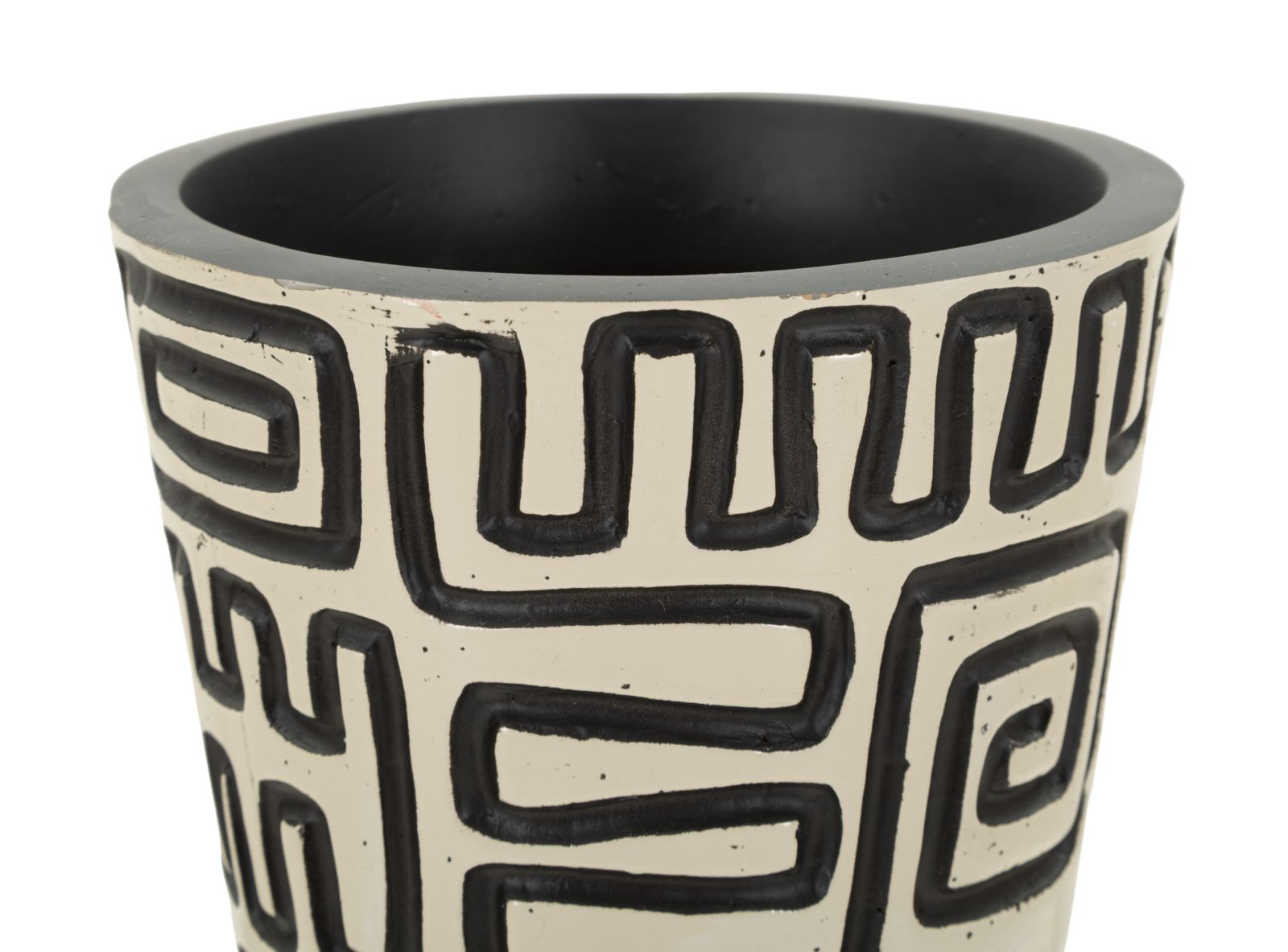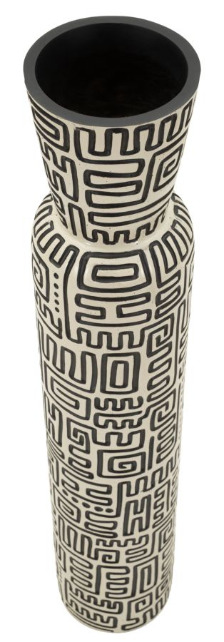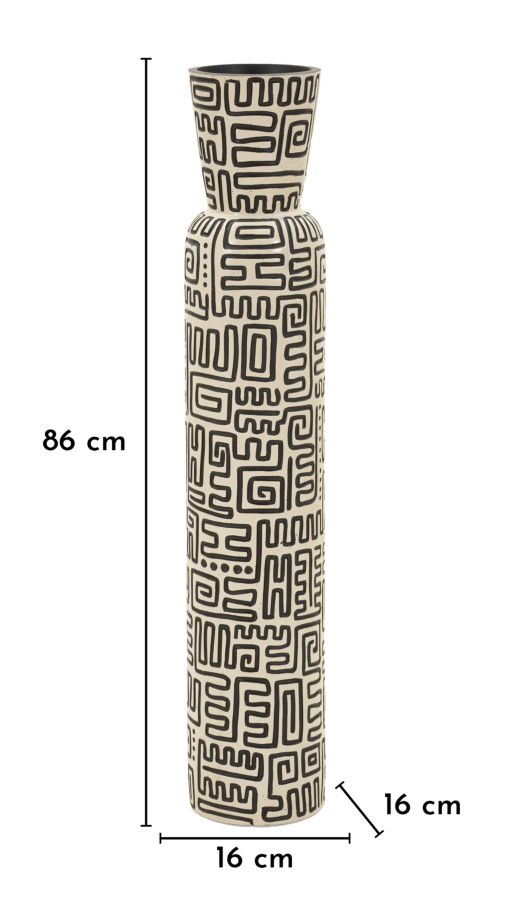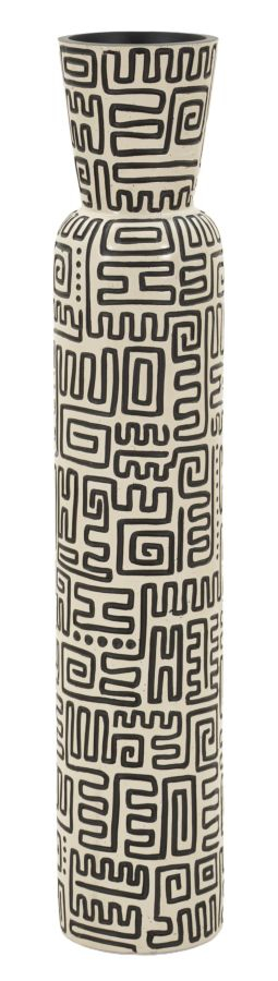 Vaza Nairobi impresionează prin silueta sa înaltă și suplă, completată de un decor grafic negru inspirat din motive tribale. Contrastul alb-negru creează un efect vizual puternic, transformând această piesă într-un element statement pentru interioare sofisticate și atent definite.