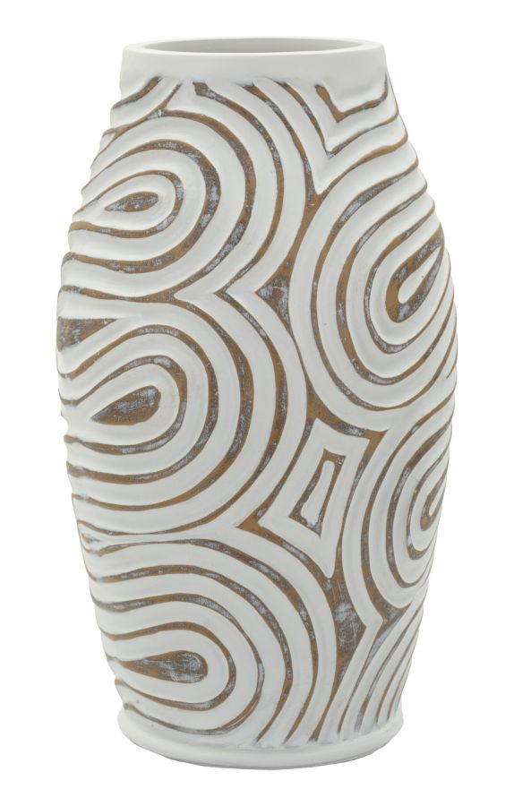 Vaza Oblix în finisaj alb white wash este o piesă decorativă compactă și rafinată, realizată din rășină, evidențiată prin decorul spiral reliefat ce conferă dinamism și profunzime. Modelul fluid creează un efect vizual modern, transformând această vază într-un accent elegant pentru interioare contemporane.