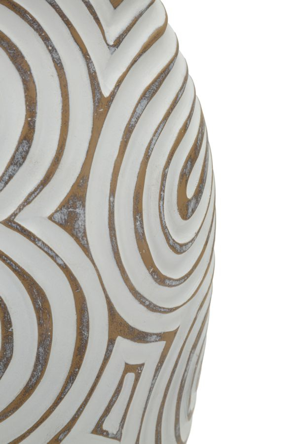 Suprafața este decorată cu linii spiralate în relief, care generează un joc subtil de umbre și texturi, accentuat de finisajul alb cu efect white wash. Contrastul delicat dintre zonele reliefate și fundalul ușor patinat oferă profunzime și personalitate piesei.