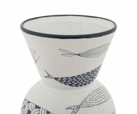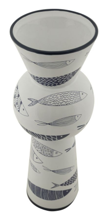 Cu un design unic inspirat din motive marine, această vază decorativă din ceramică, având dimensiuni de 14 cm lățime și 38,5 cm înălțime, aduce un farmec aparte oricărui interior. Decorată cu pești stilizați în tonuri de alb și albastru, vaza se remarcă prin forma sa distinctivă, cu o bază conică și un corp rotunjit, devenind astfel un punct de atracție în orice încăpere. Este ideală pentru a fi expusă pe o etajeră, un pervaz sau într-o bucătărie cu influențe maritime, oferind un strop de prospețime și originalitate decorului tău. Vaze decorative precum aceasta sunt excelente pentru a aduce un plus de personalitate și un aer relaxant în orice spațiu, contribuind la un decor plin de viață și stil.