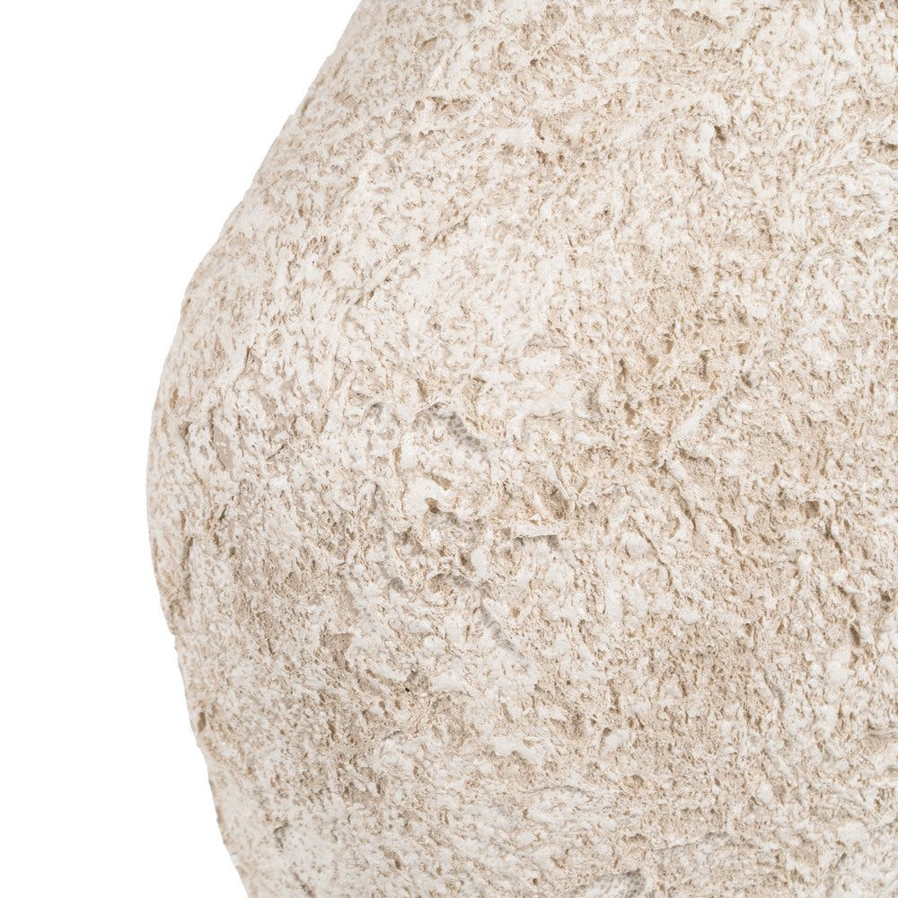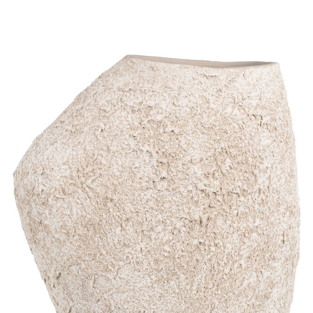 Suprafața vazei este bogată în textură, cu un finisaj ușor neregulat care îi oferă un aspect autentic și plin de caracter. Nuanța de alb este caldă și ușor de integrat, iar forma ușor neregulată adaugă dinamism fără a încărca vizual spațiul.