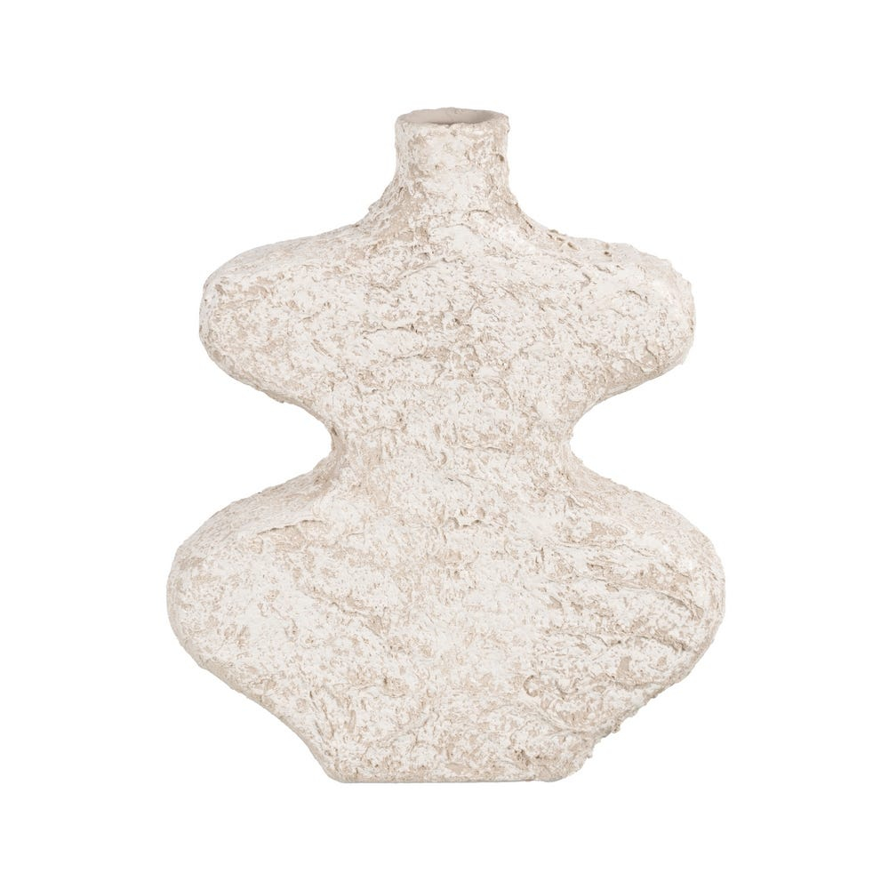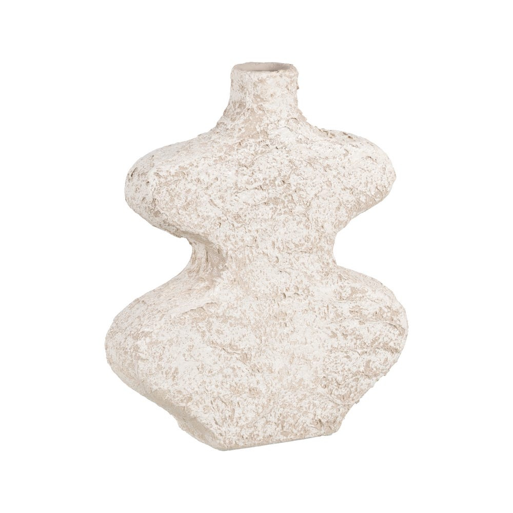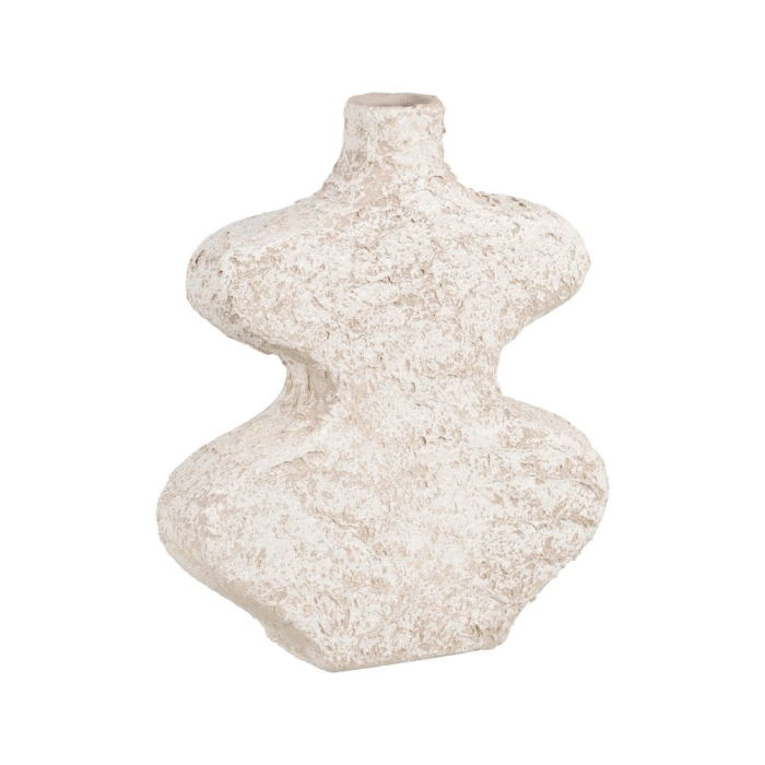 Suprafața este texturată și ușor neregulată, ceea ce oferă vazei un aspect autentic și plin de caracter. Nuanța de alb se integrează ușor în diferite tipuri de amenajări și pune în valoare forma aparte, cu linii curbe și volume bine definite.