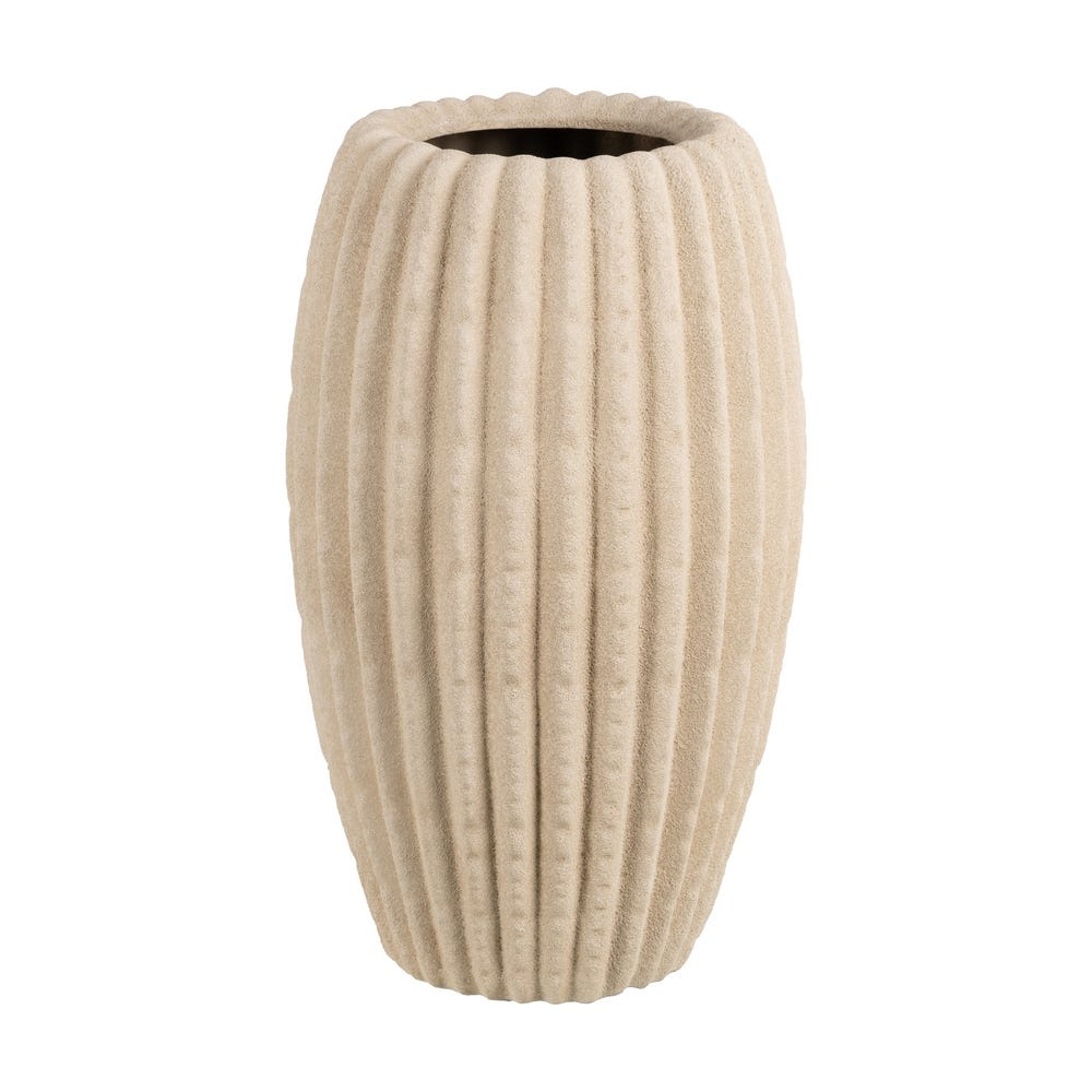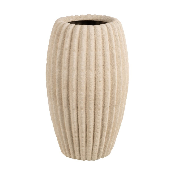 Suprafața este decorată cu linii verticale în relief, care oferă textură și pun în valoare forma vazei. Nuanța de bej este caldă și versatilă și contribuie la crearea unui ambient relaxat și armonios.