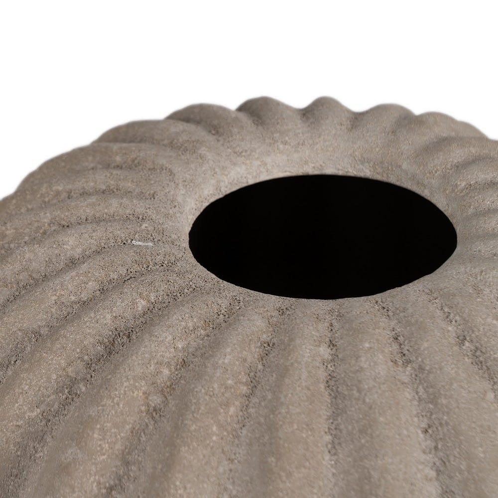Suprafața este decorată cu un model striat în relief, care adaugă textură și creează un joc vizual subtil. Nuanța de gri închis oferă contrast și evidențiază forma rotunjită, contribuind la un decor echilibrat și elegant.