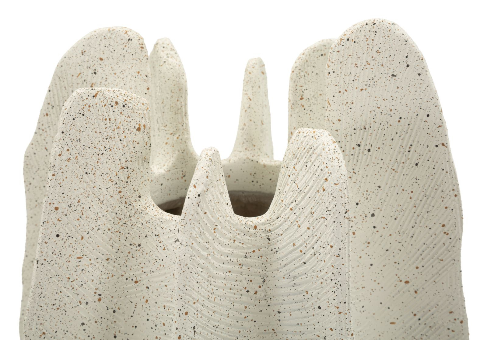 Suprafața sa prezintă o textură fină, ușor granulată, care evidențiază caracterul natural al formei. Silueta alungită, cu muchii neregulate și detalii verticale, creează un efect vizual puternic, transformând vaza într-un element central al amenajării.