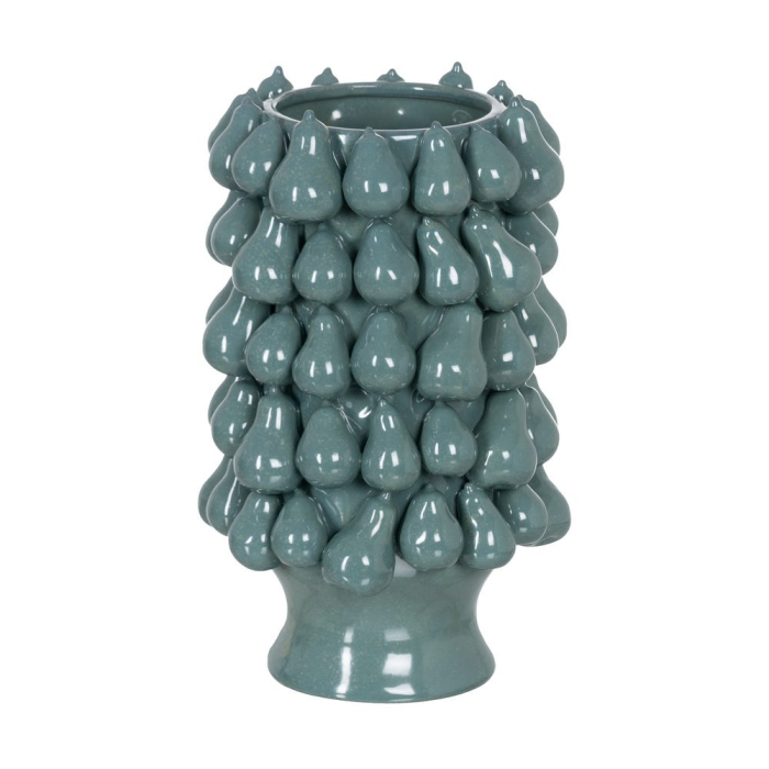Corpul vazei este acoperit cu numeroase elemente reliefate în formă de pere care creează volum și o textură vizuală foarte interesantă. Aceste detalii dau obiectului un aspect sculptural și îl transformă într o piesă decorativă care poate fi admirată din mai multe unghiuri.