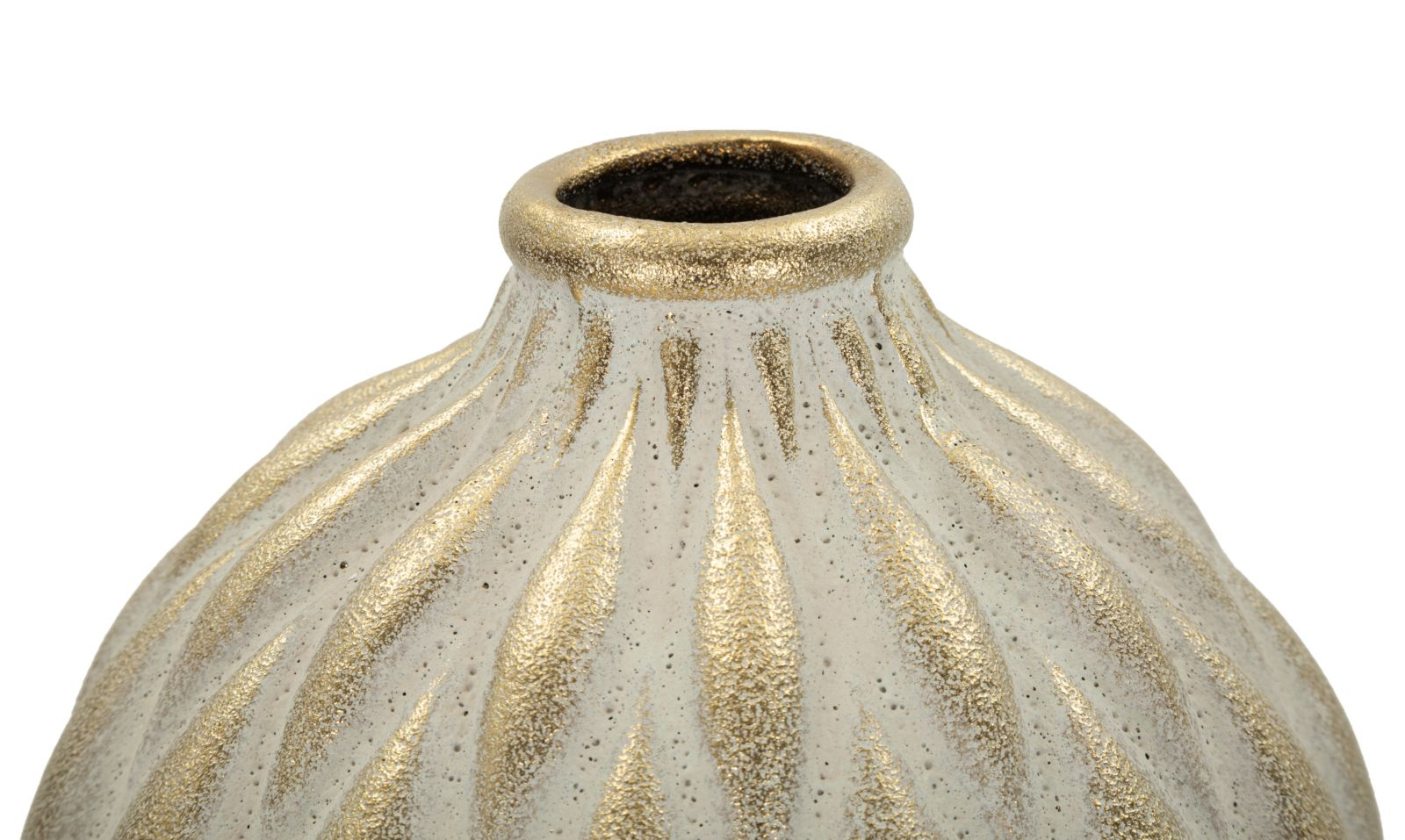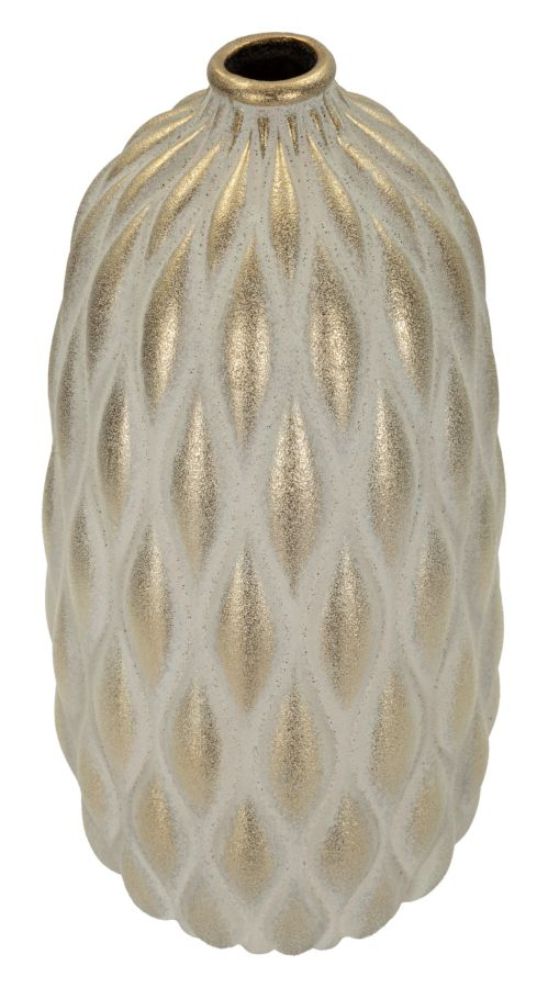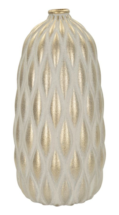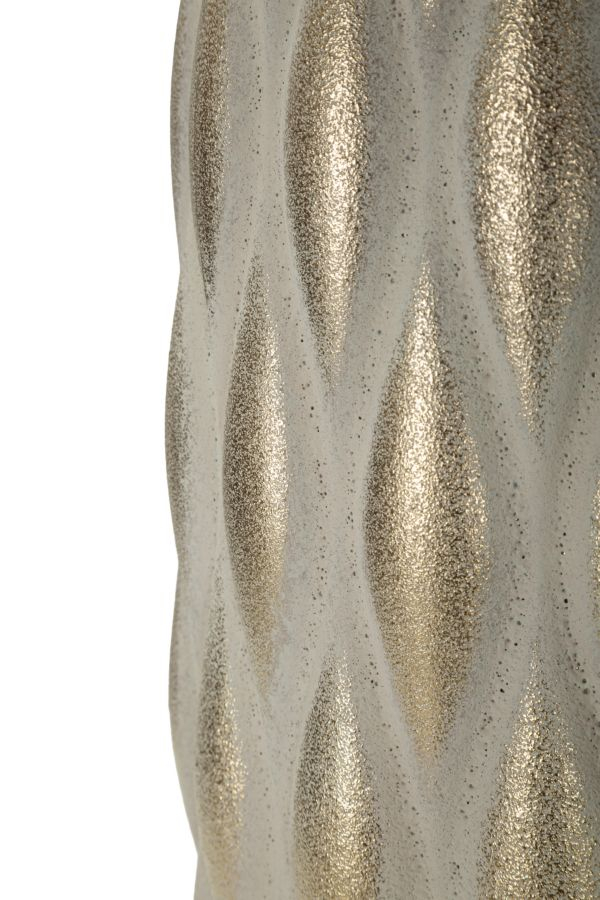 Modelul reliefat cu forme alungite oferă profunzime și dinamism suprafeței, transformând vaza într-un element decorativ de impact. Combinația dintre finisajul mat și reflexiile aurii creează un echilibru între eleganță discretă și detalii luxoase.
