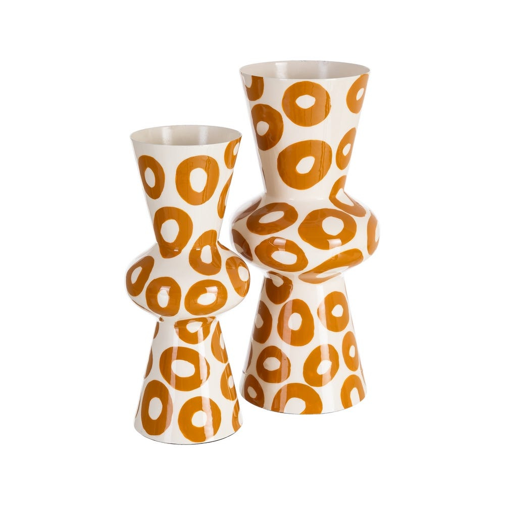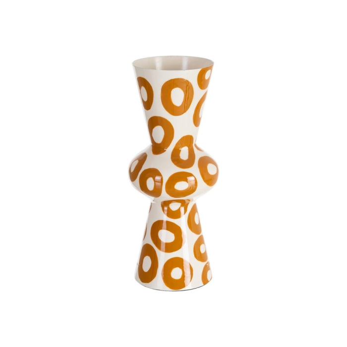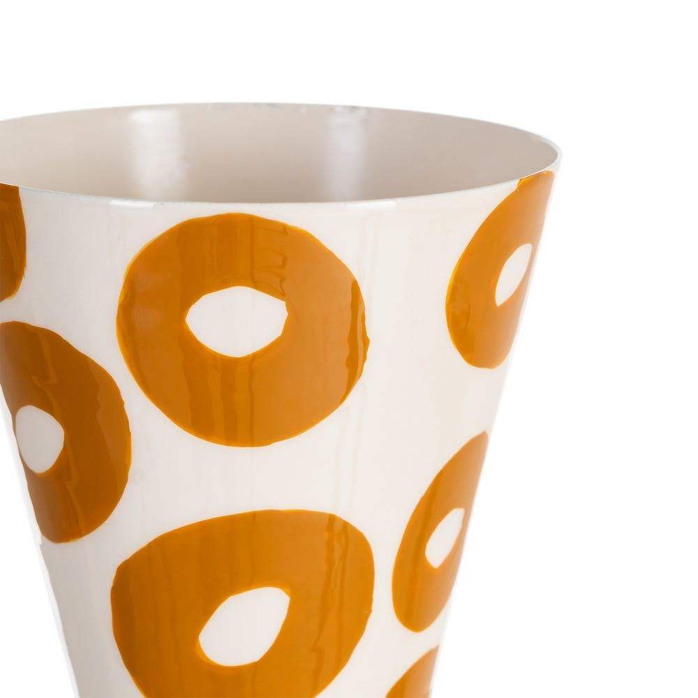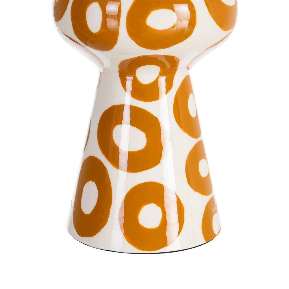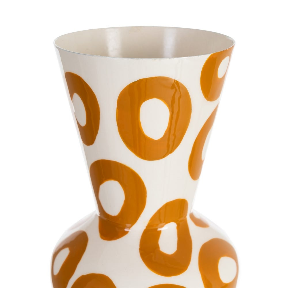 Această vază decorativă se remarcă prin silueta sa verticală sculpturală și prin decorul grafic compus din motive circulare repetate în nuanță muștar. Contrastul dintre fundalul alb lucios și formele organice creează un efect vizual expresiv, cu influențe artistice contemporane.