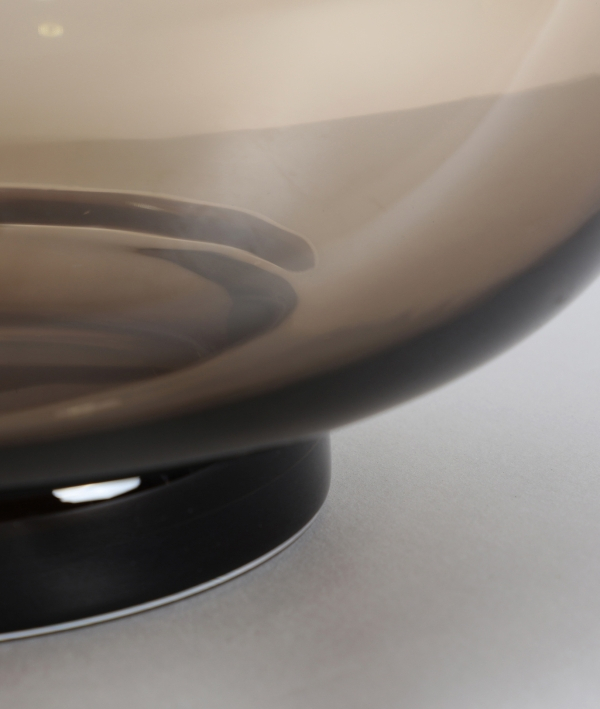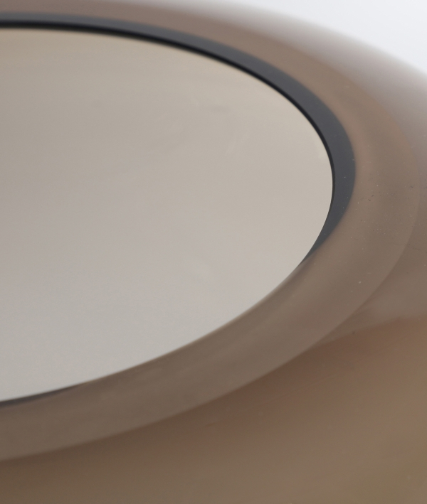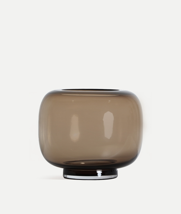 Silueta rotunjită, cu volum compact și margini perfect netede, este realizată din sticlă maro translucidă, creând un joc subtil de lumină și reflexii. Designul său minimalist inspiră liniște și rafinament, fiind ideal pentru amenajări actuale.