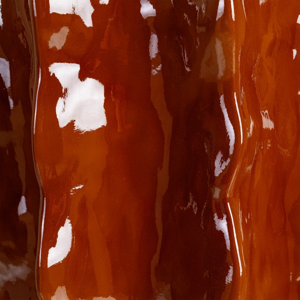Volumul vertical, ritmat de muchii ondulate, creează un joc de lumini pe suprafața glazurată și conferă obiectului o ținută sculpturală. Nuanța caldă de teracotă aduce profunzime și se leagă natural de lemn, ratan și textile din in sau bumbac.