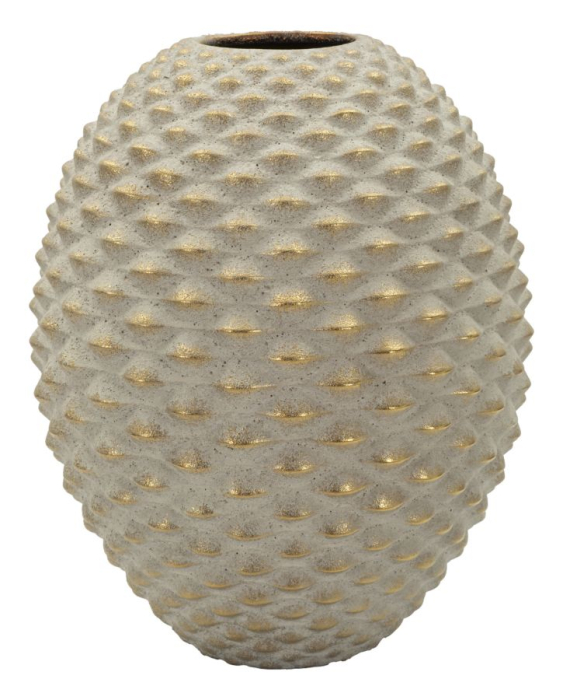 Vaza Pepipas Ball în nuanță gri cu accente aurii este o piesă decorativă cu formă sferică elegantă, realizată din ceramică, care atrage imediat privirea prin textura sa reliefată cu efect de bijuterie. Prezența sa scenografică și proporțiile generoase o transformă într-un element central al amenajării, potrivit pentru interioare rafinate și expresive.