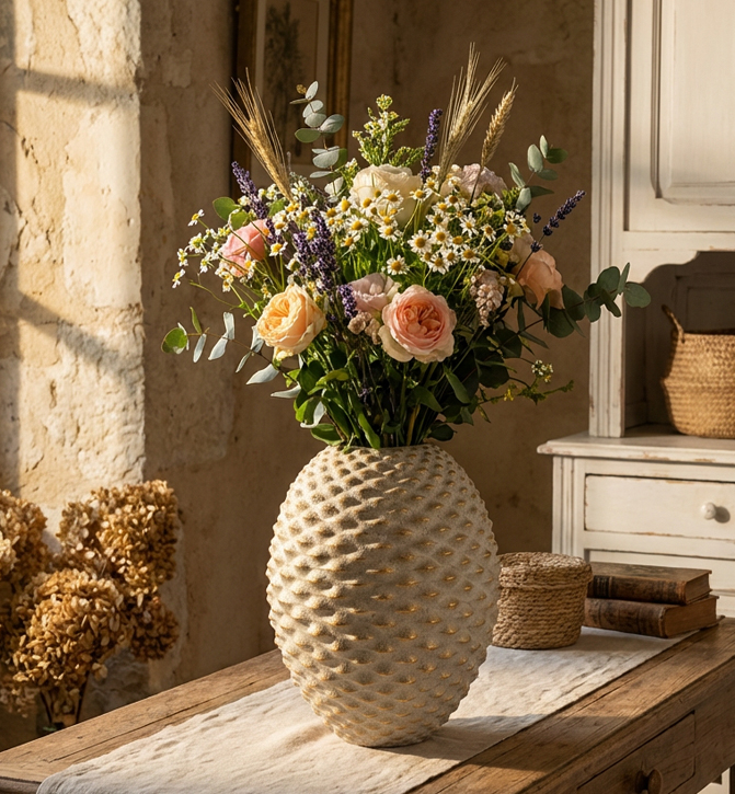 Sfatul designerului CreativDeco: Amplasează vaza Pepipas Ball într-un spațiu deschis, bine luminat, pentru a evidenția textura reliefată și reflexiile aurii, transformând-o într-un element statement care exprimă rafinamentul și selecția premium CreativDeco.