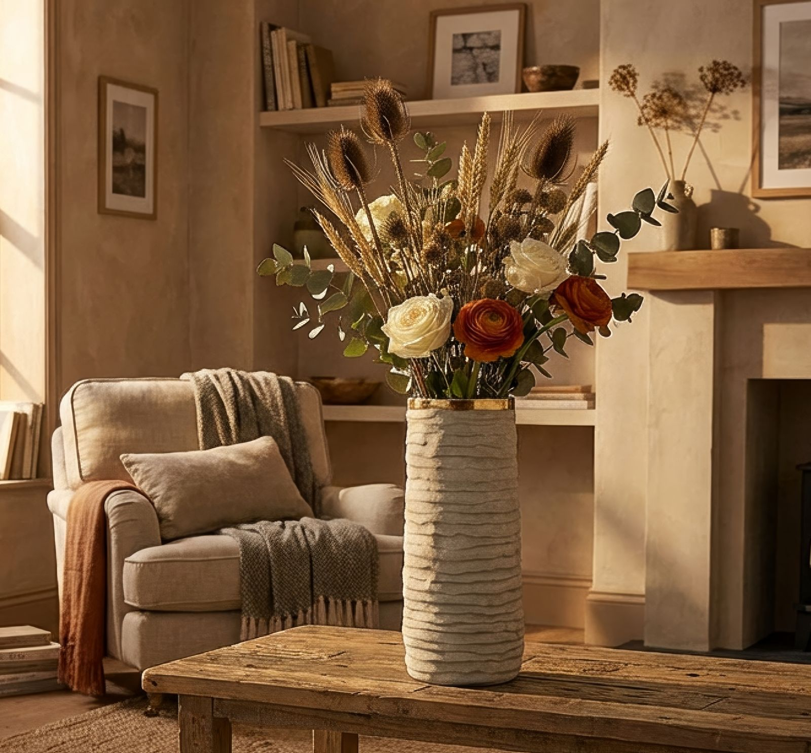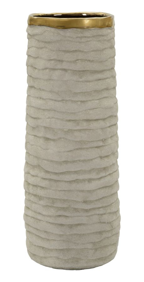Suprafața exterioară este marcată de un relief orizontal discret, care adaugă profunzime și un aspect material autentic. Interiorul auriu, vizibil prin deschiderea amplă, reflectă lumina și oferă un contrast sofisticat față de tonul gri neutru al exteriorului.
