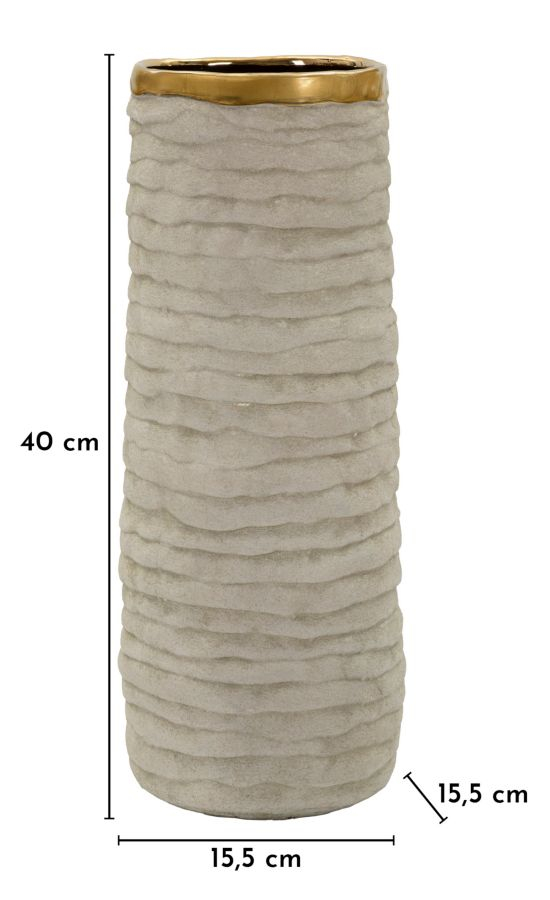 Vaza Lima Open în nuanță gri cu interior auriu este o piesă decorativă cilindrică, realizată din ceramică, cu deschidere largă și finisaj natural texturat. Contrastul dintre exteriorul mat și interiorul auriu lucios creează un efect vizual elegant, potrivit pentru interioare moderne în care detaliile rafinate definesc atmosfera.