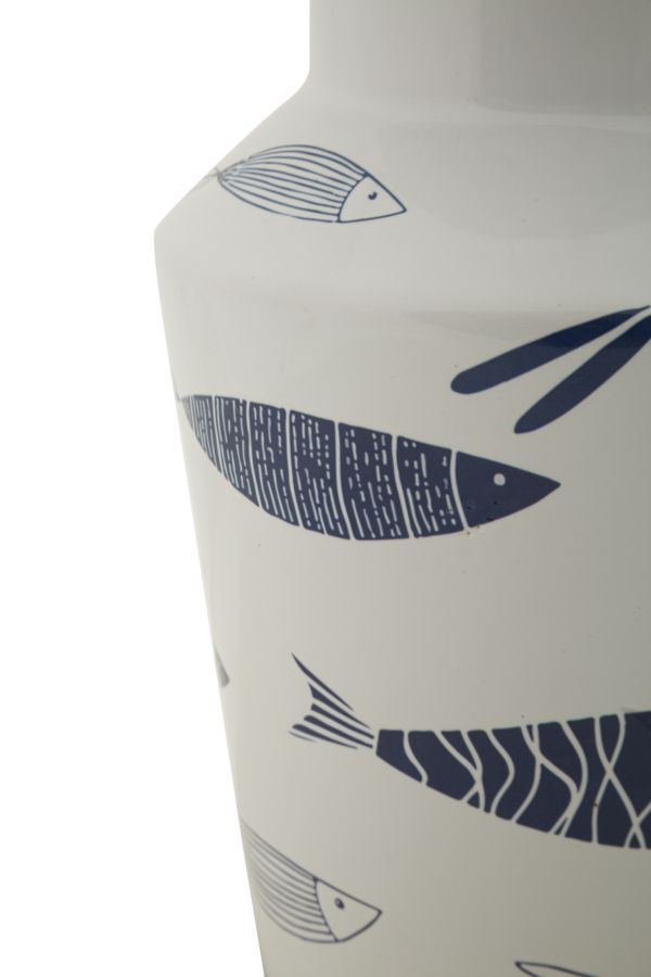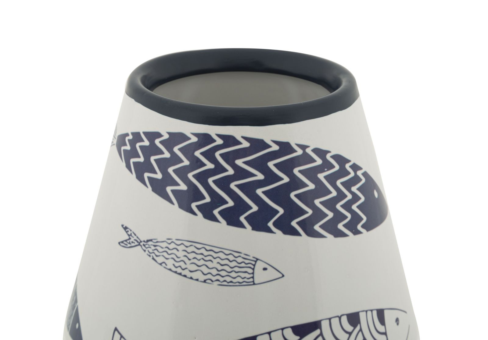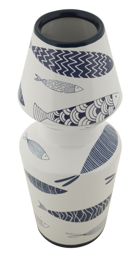Cu un design modern și inspirat din motive marine, această vază decorativă din ceramică, având dimensiuni de 14 cm lățime și 34 cm înălțime, este o alegere excelentă pentru a adăuga un plus de stil și prospețime în orice decor. Decorată cu pești stilizați în tonuri de alb și albastru, această vază oferă un accent vizual dinamic și plin de viață. Forma sa distinctivă, ce îmbină elemente geometrice cu linii elegante, o face perfectă pentru a fi plasată pe un raft, o măsuță de cafea sau într-un birou, aducând astfel un aer relaxant și personalizat în orice spațiu. Vaze decorative de acest gen sunt ideale pentru a completa un decor modern și plin de originalitate.