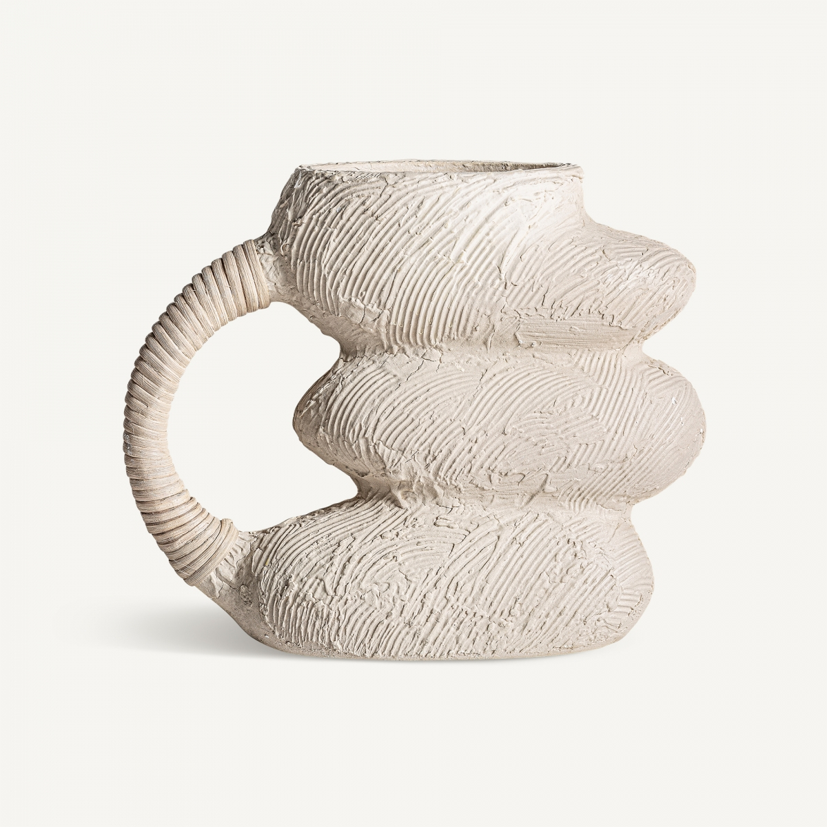 Această vază, o creație artizanală rafinată, se distinge printr-o formă alungită și elegantă, modelată cu pricepere din rășină în nuanțe delicate și luminoase. Cu dimensiuni de 31 cm lățime, 11 cm adâncime și 25 cm înălțime, cântărind 2,2 kg, vaza oferă o prezență grațioasă și modernă în orice spațiu. Rășina în tonuri deschise creează un efect vizual eteric și sofisticat, cu subtile variații de culoare care adaugă profunzime și interes. Fiecare piesă este unică, reflectând măiestria artizanului prin texturi fine și detalii individuale.