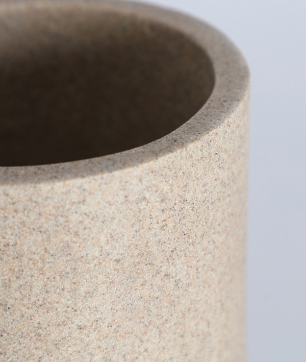 Realizată din rășină cu o textură ce imită piatra, vaza prezintă o bază rotunjită și un corp cilindric perfect proporționat. Silueta verticală oferă un caracter modern și versatil, potrivit atât ca obiect decorativ solitar, cât și ca suport pentru aranjamente minimaliste.