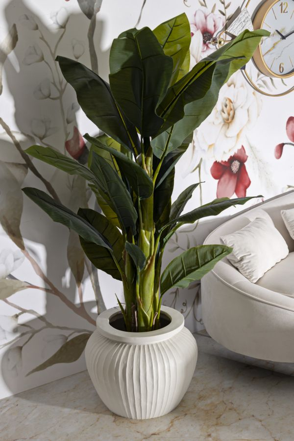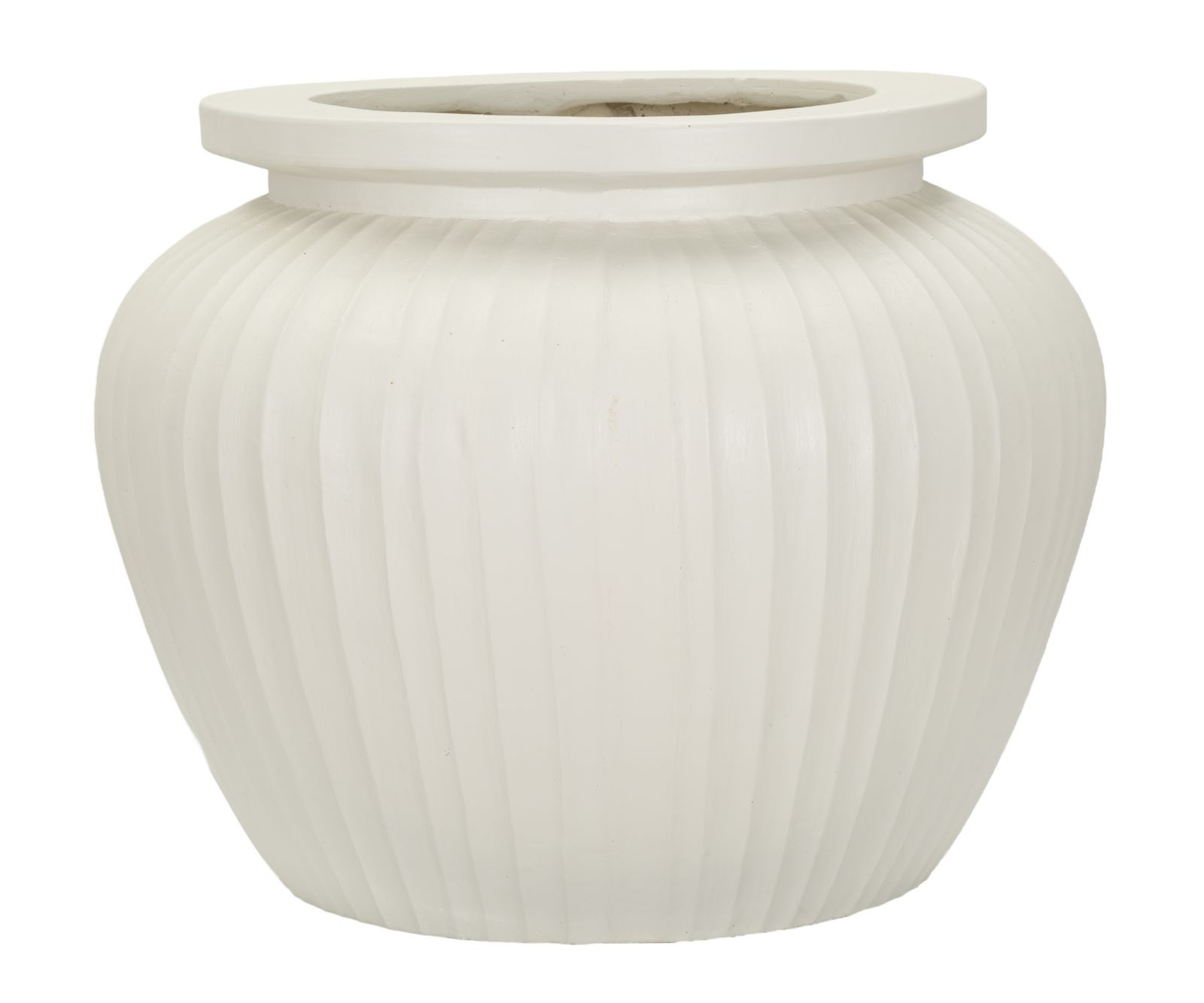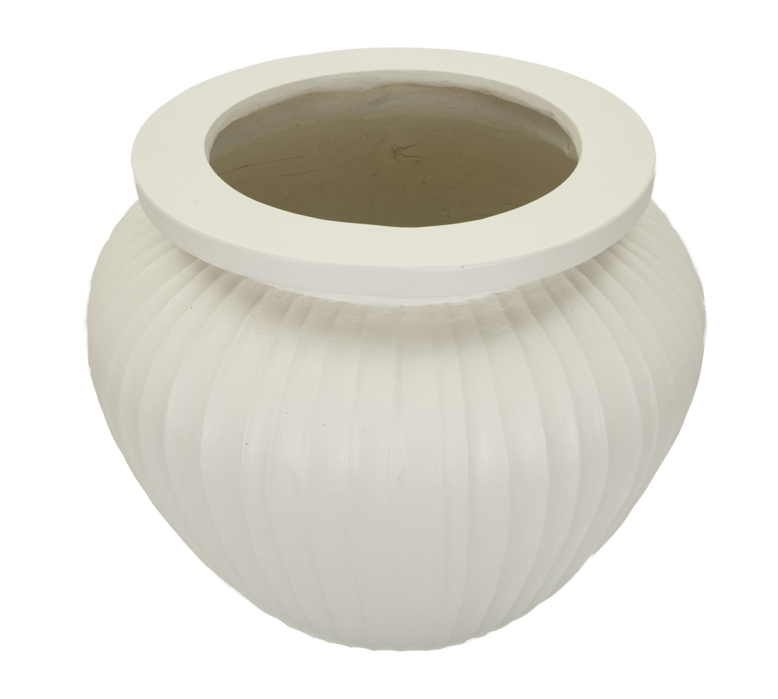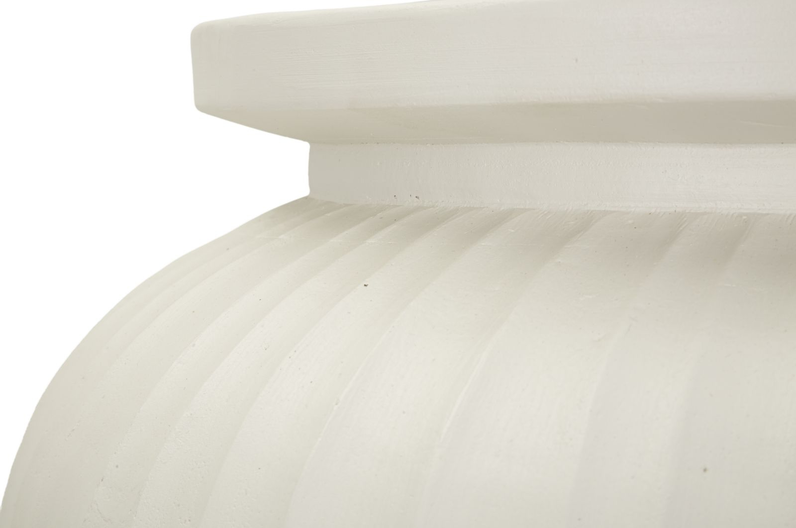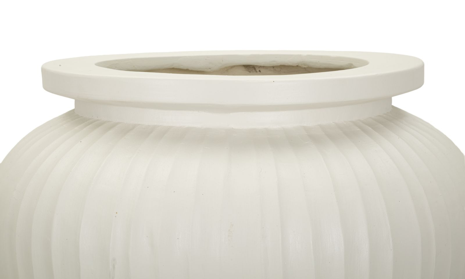 Textura fină, dispusă vertical, captează lumina și adaugă ritm vizual, iar nuanța crem mat păstrează un aer curat și calm. Forma amplă echilibrează proporțiile și transformă piesa într-un accent decorativ potrivit pe podea, lângă o consolă sau în hol.