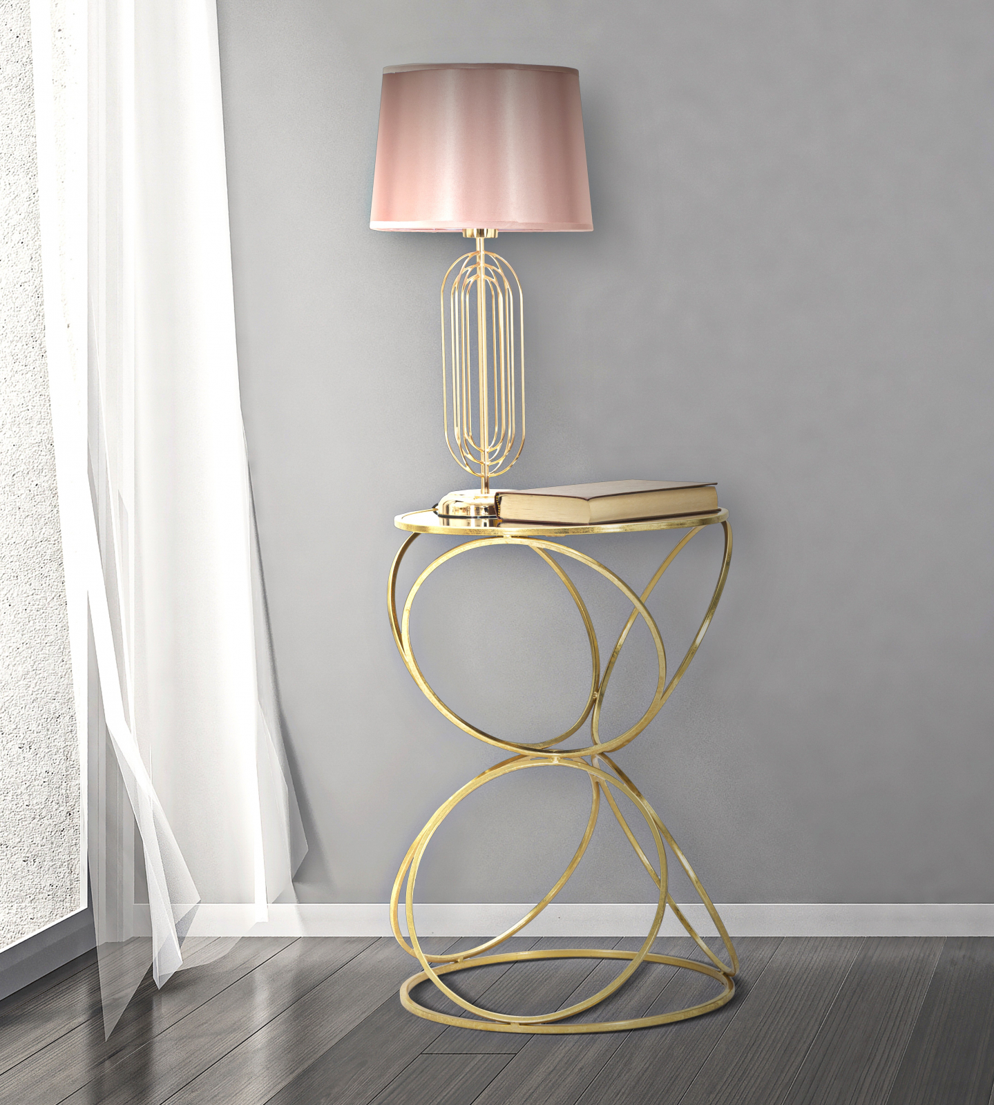 Veioza eleganta cu decoratiuni metalice si linii geometrice curate.