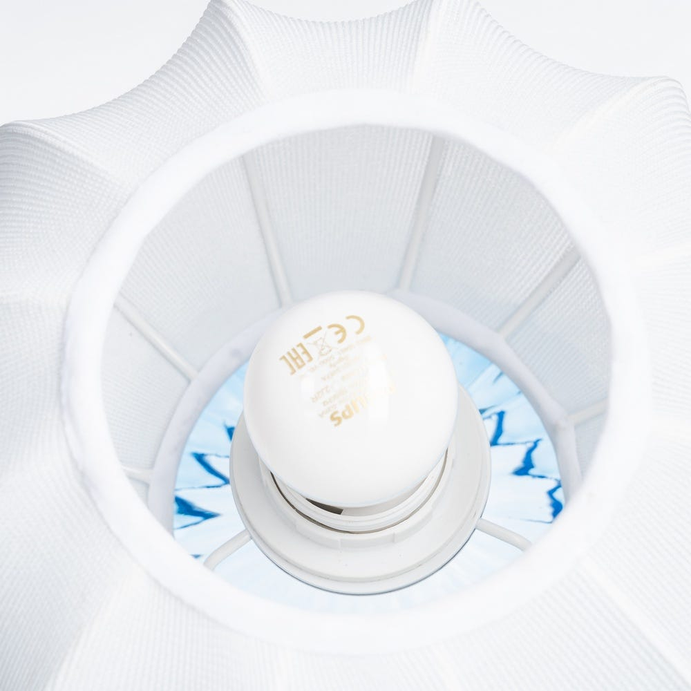 Este realizată din bază decorativă din sticlă albastră și abajur din bumbac alb.