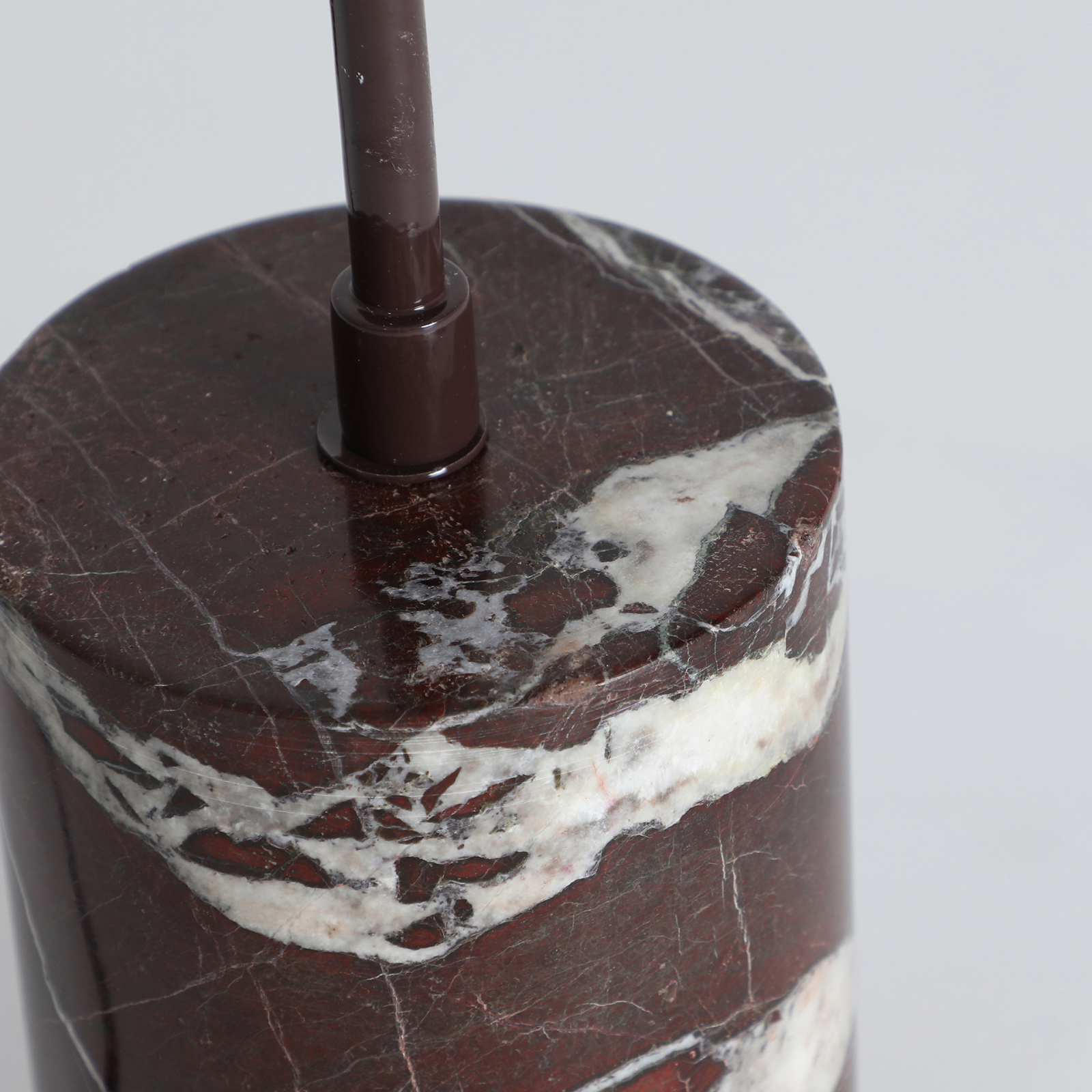 Baza cilindrică din marmură sintetică cu venaturi vizibile ancorează vizual piesa și îi oferă o prezență stabilă, iar structura metalică păstrează o linie clară până la abajurul conic. Finisajul în nuanță ciocolatiu creează un efect profund, cu reflexii discrete, care se schimbă frumos odată cu lumina din încăpere.