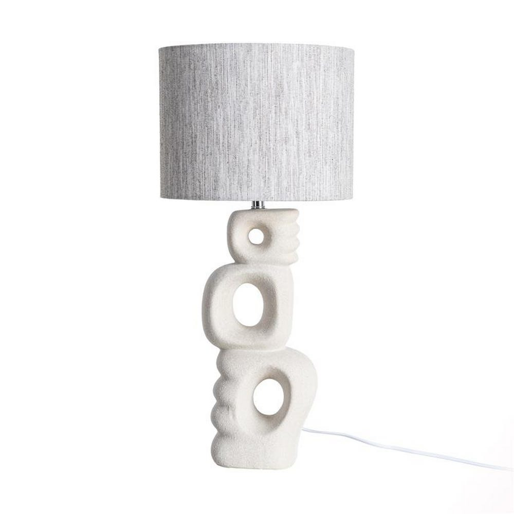 Lampă de masă din ceramică albă cu aspect de piatră formă abstractă suprapusă cu decupaje și abajur gri din țesătură de in 28 x 28 x 60 cm