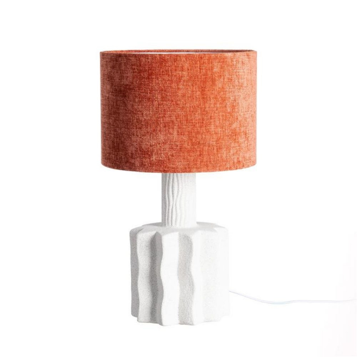 Lampa are bază din ceramică albă cu relief vertical și abajur cilindric din țesătură de in de culoare teracotă.