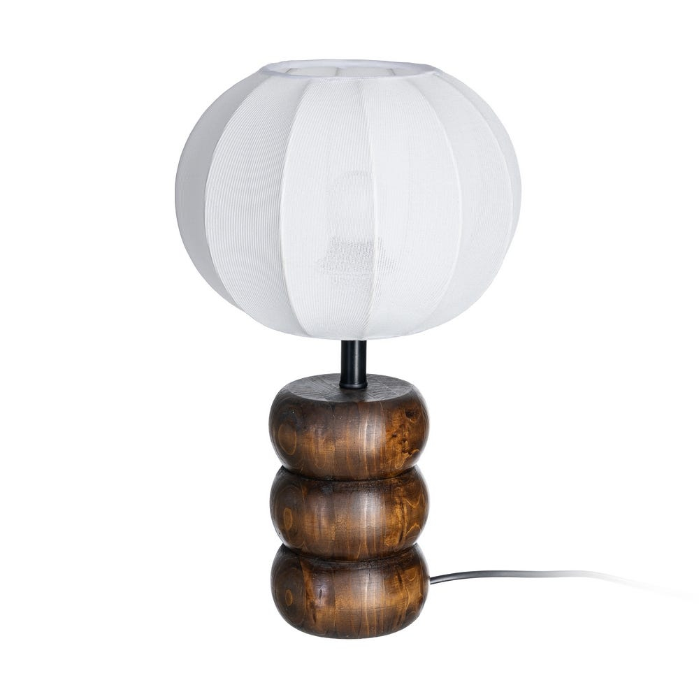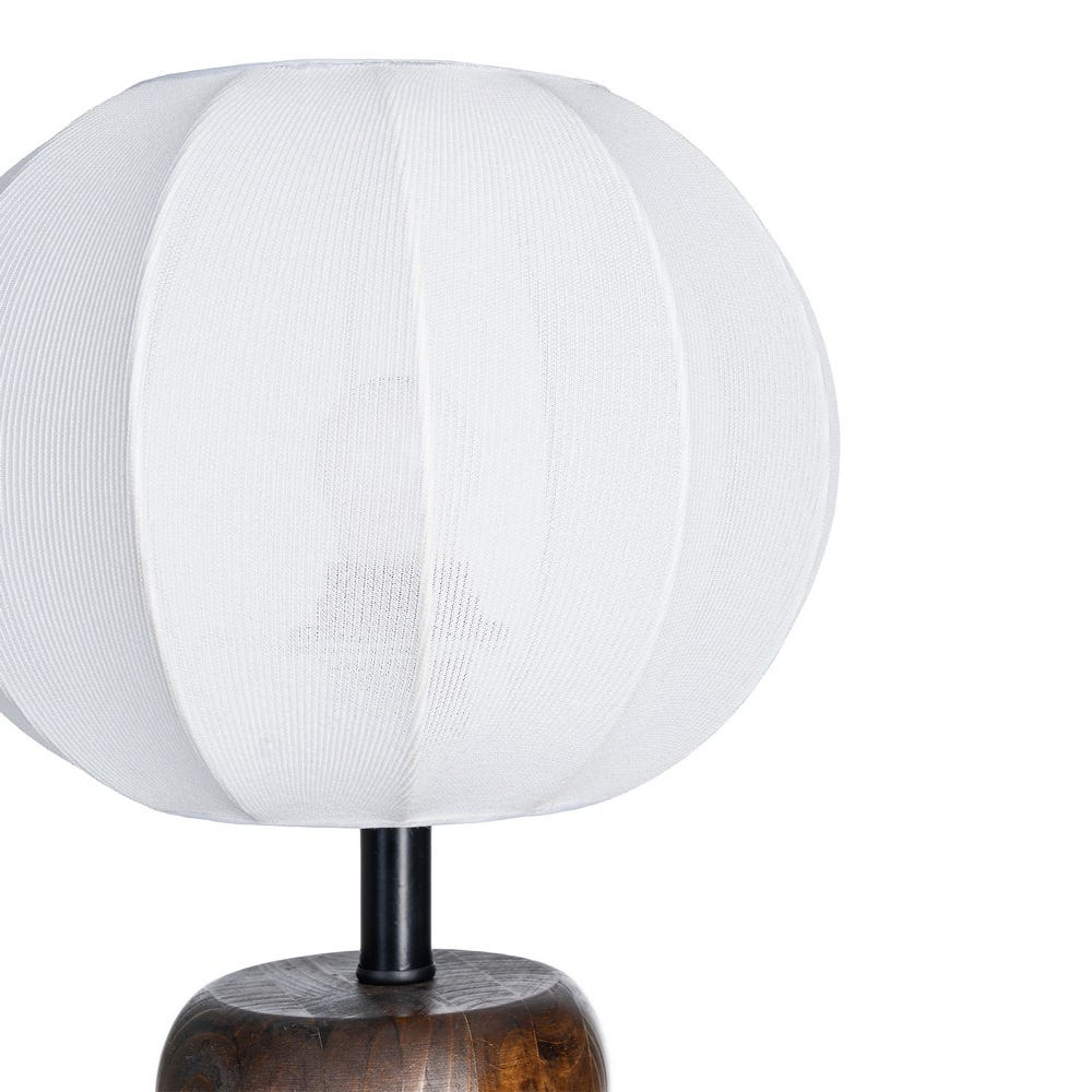 Această lampă de masă este concepută ca un obiect decorativ cu rol funcțional, potrivit pentru amenajări de interior care pun accent pe materiale naturale și iluminare ambientală. Baza din lemn, cu forme rotunjite și volum bine definit, este completată de un abajur textil din bumbac, care oferă o lumină difuză și plăcută.