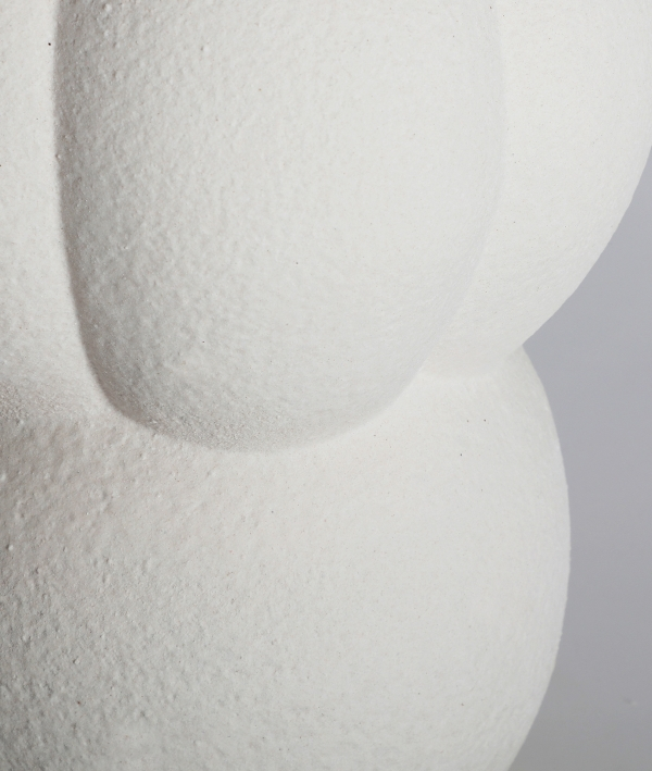 Baza ceramică este modelată în volume organice rotunjite, ce creează un efect sculptural aparte. Textura off-white adaugă un aspect mat, rafinat, ce conferă un caracter natural și modern în același timp. Deasupra, abajurul de culoare maro, cu aspect textil vizibil, completează perfect compoziția.