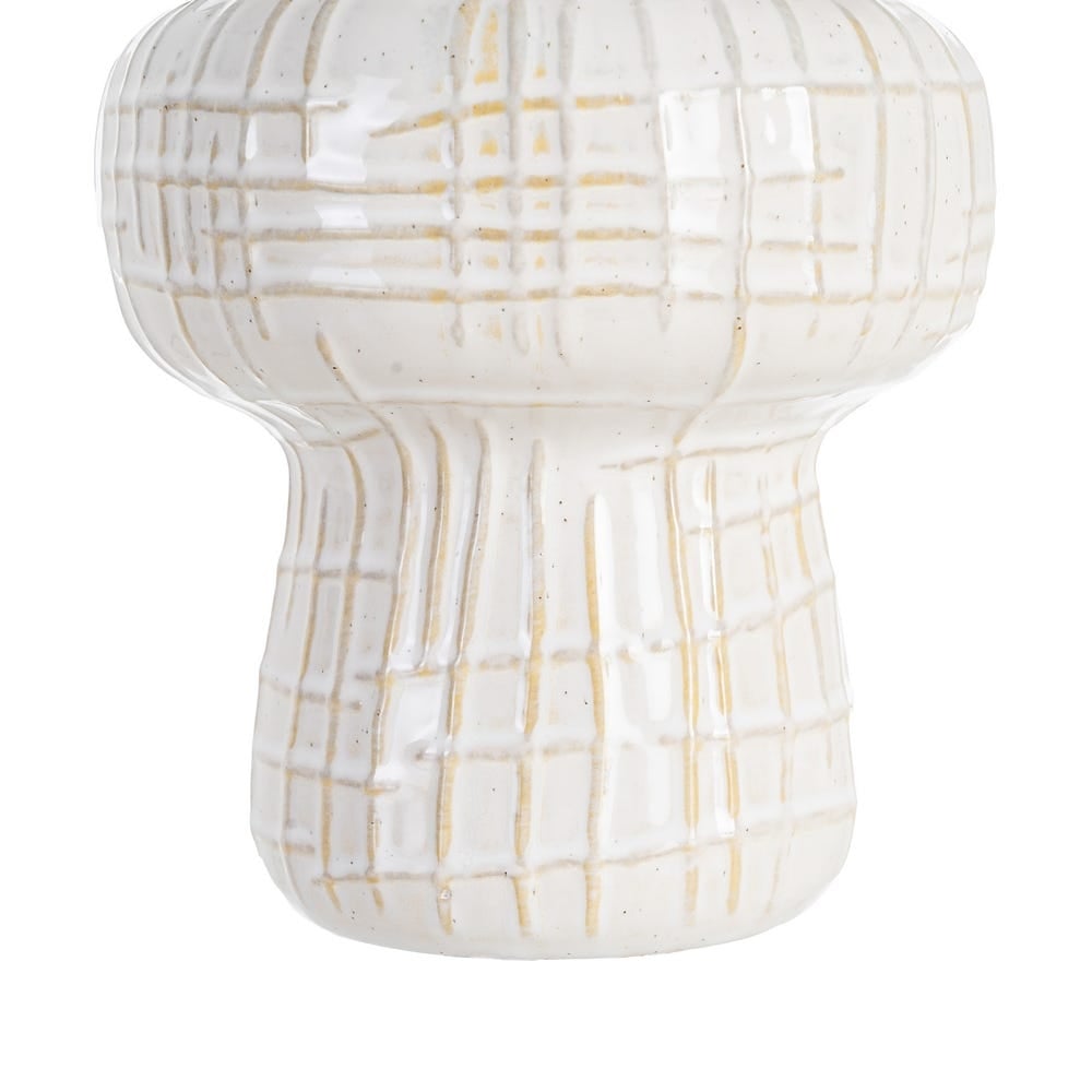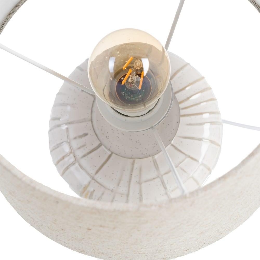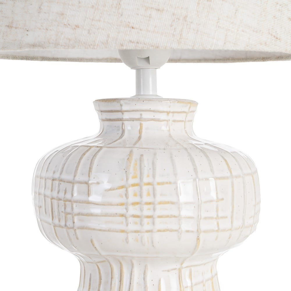 Veioză cu bază ceramică albă și abajur textil: lampă de masă modernă cu lumină difuză plăcută pentru noptieră, birou sau comodă. Finisaj alb/crem și bază sculptată din ceramică oferă eleganță subtilă. Compatibilă cu dulie E27, bec până la 60W (neinclus).