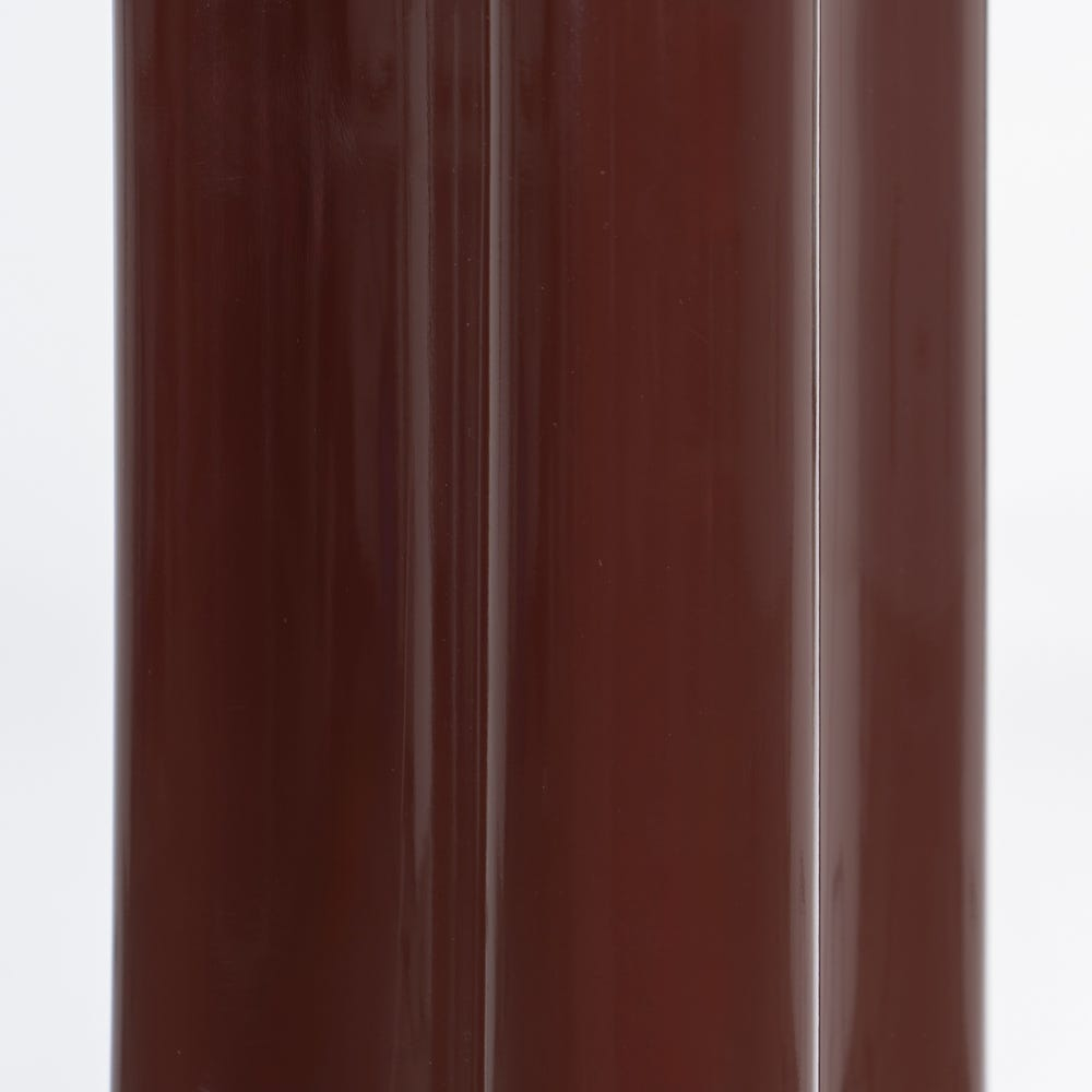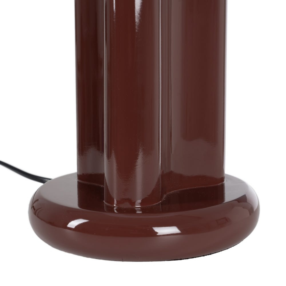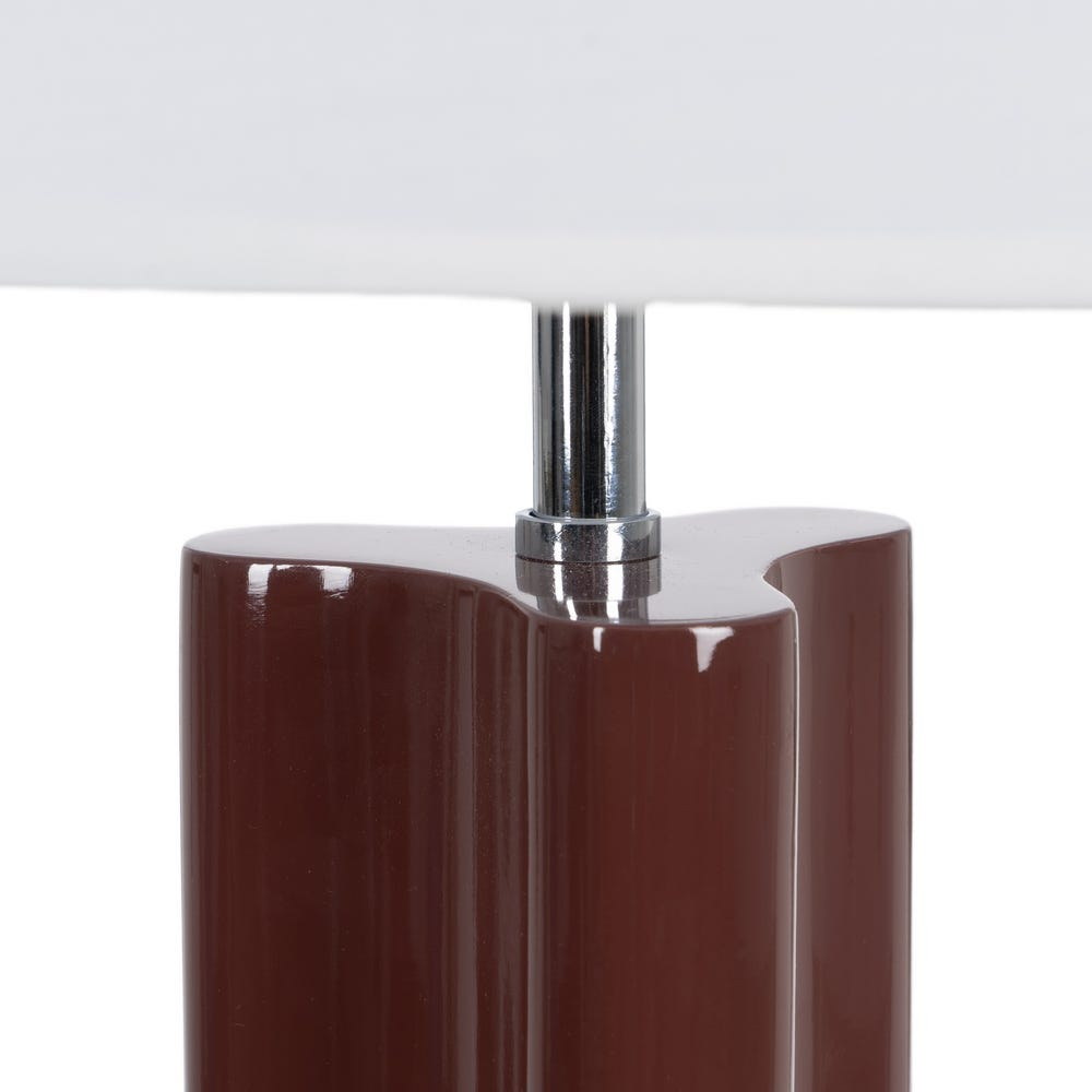 Nuanța grena, cu luciu profund, încălzește vizual decorul și contrastează elegant cu abajurul alb din bumbac care difuzează uniform lumina. Proporțiile echilibrate și silueta verticală conferă prezență grafică, însă păstrează o delicatețe vizuală potrivită interioarelor moderne.