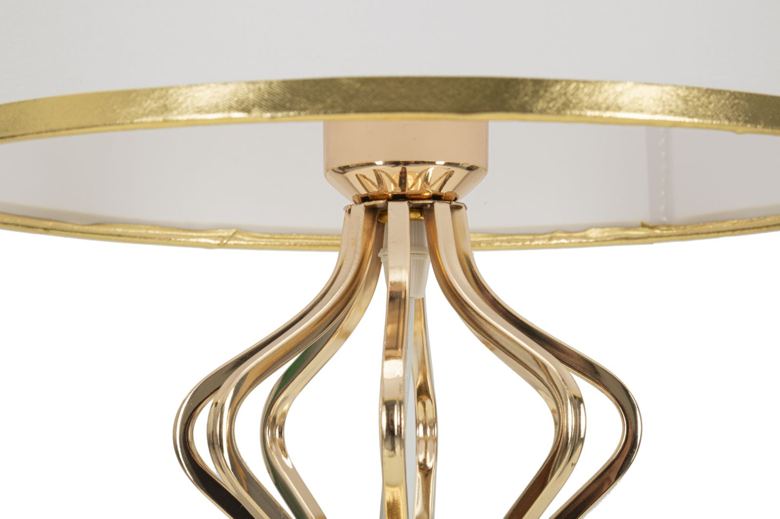 Veioză metalică aurie cu design fluid, lampă de masă versatilă. Abajur alb complementar, se adaptează diverselor stiluri de interior, de la clasic la modern. Produs din colectia de toamna 2024!
