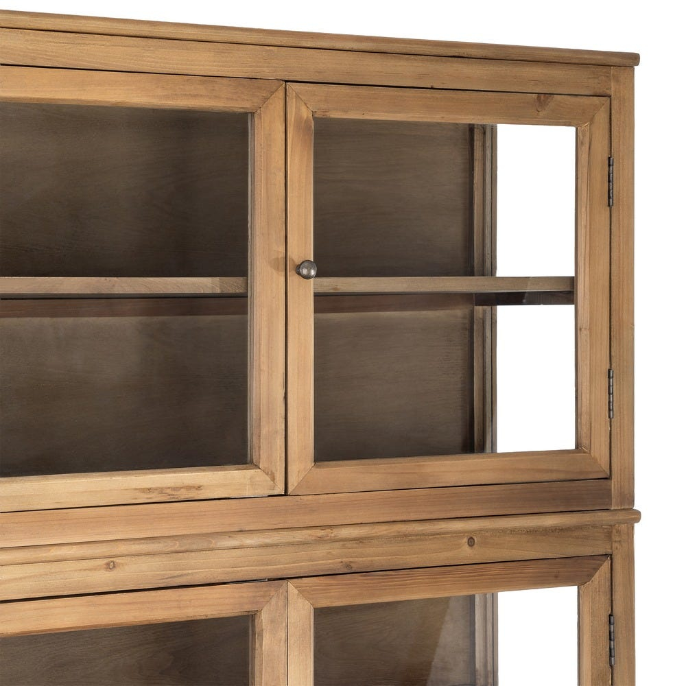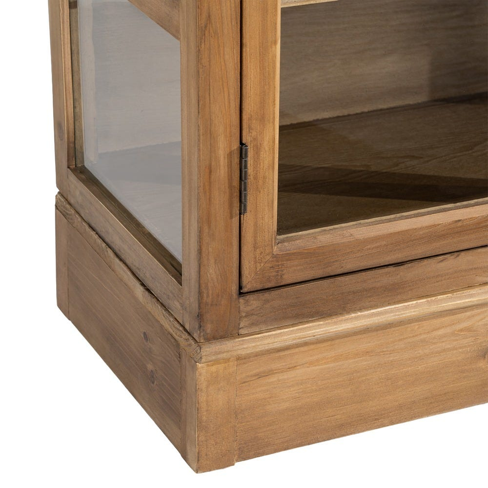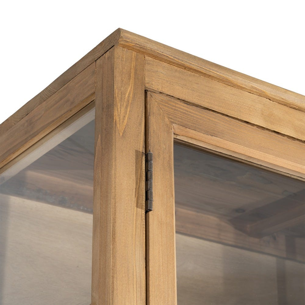 Fiecare modul este prevăzut cu uși din sticlă care permit vizibilitatea obiectelor expuse, iar interiorul este organizat cu rafturi dispuse uniform. Nuanța maro a lemnului pune în valoare textura naturală și liniile drepte ale structurii, accentuând caracterul autentic al piesei.