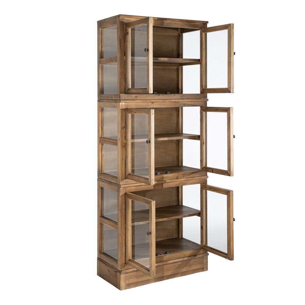 Structura este compusă din trei module suprapuse, fiecare prevăzut cu uși din sticlă și rafturi interioare pentru organizarea obiectelor pe niveluri distincte.
