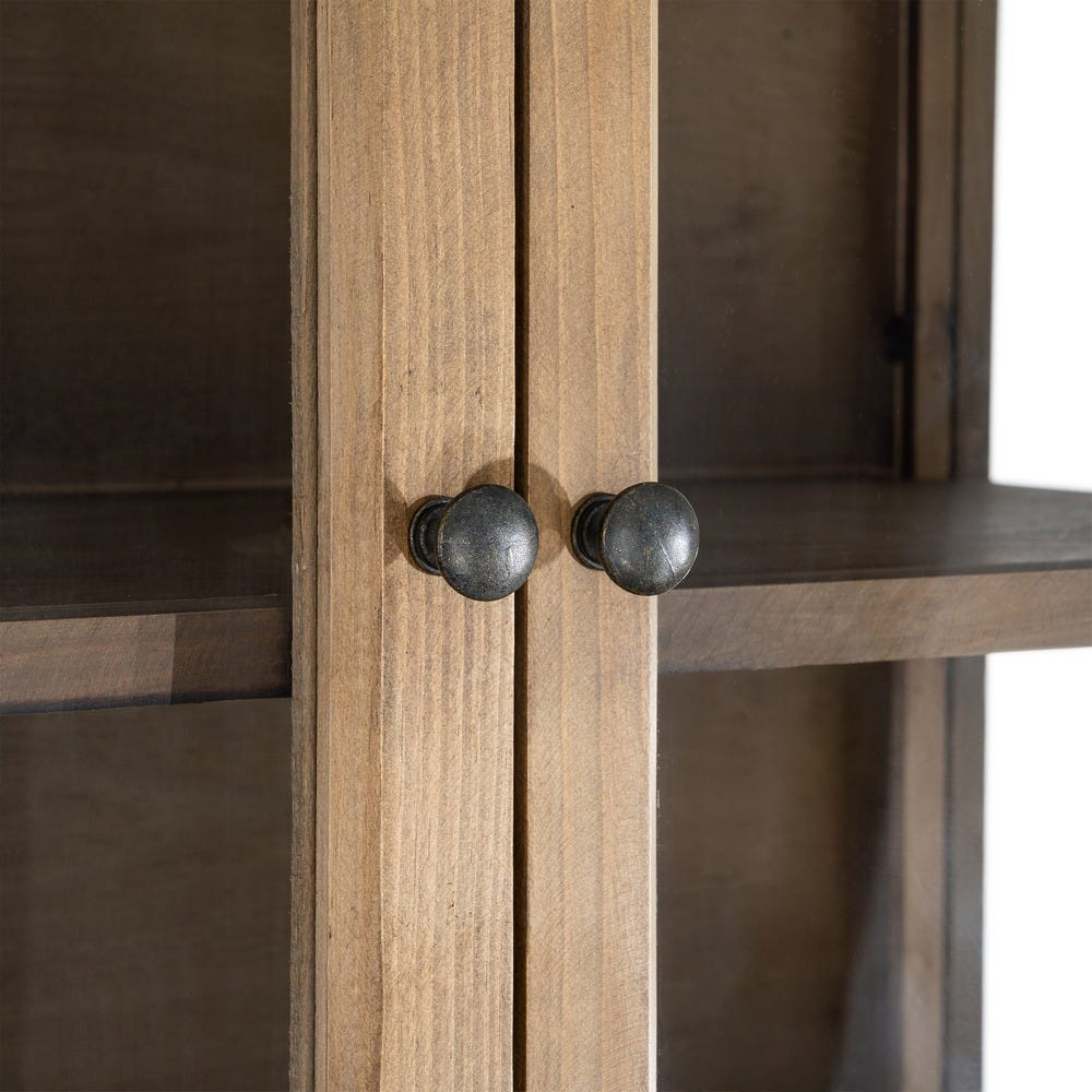 Ușile din sticlă permit vizibilitatea obiectelor expuse pe rafturi, protejând în același timp conținutul și contribuind la un aspect elegant și aerisit al piesei.